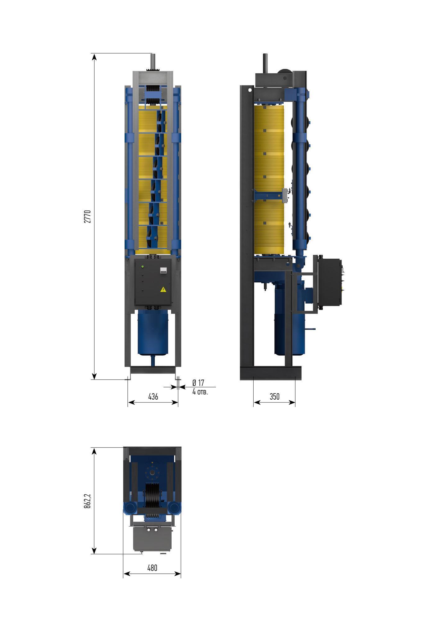 | Наименование | Максимальное тяговое усилие, кг | Количество секций на барабане | Канатоемкость, м | Диаметр каната, мм | Скорость намотки каната на барабан, м/с | Мощность электропривода, кВт | Масса лебедки со шкафом управления, кг |