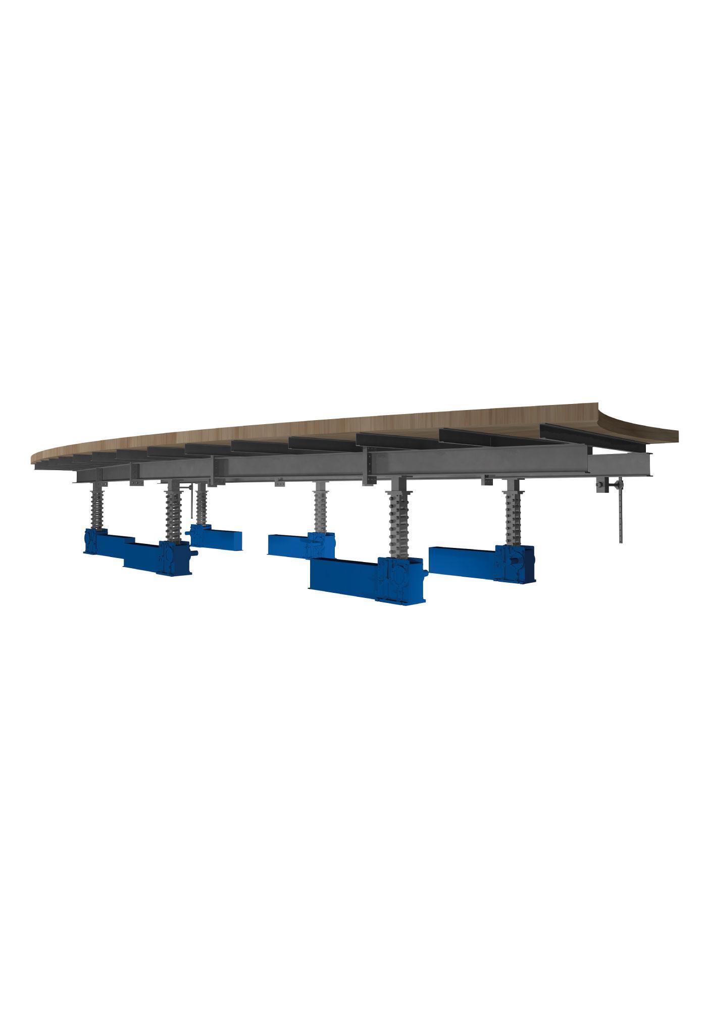 Новейшими типами приводов считаются толкающие цепи Serapid. Данный привод обеспечивает высокую скорость движения цепи – до 12 м/мин, высоту подъема до 14 метров. В нижнем положении цепь уложена в специальном магазине. При выходе из магазина за счет особой запатентованной конструкции цепь превращается в жесткий толкающий стержень. Толкающие механизмы весьма компактны, размещаются в приямках, трюмах. Абсолютная надежность, плавность перемещения, компактность, низкий уровень шума, оптимальное сочетание цена-качество сделали цепи Serapid необычайно популярным в последние годы. Выбор вариантов конструкции нижней механики и систем трансформации определяются на этапе согласований и проектирования.