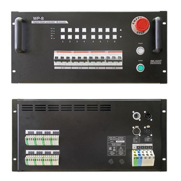 Блок управления цепными лебедками, 8 каналов, автоматы 3п10А, реверсивные контакторы, ввод питания и подключение потребителей: быстрозажимные клеммы, органы управления на передней панели, возможность подключения внешнего управления по протоколу DMX512, подключение внешнего сигнала аварийной остановки E-STOP, исполнение корпуса рэковое, высота 5U.