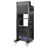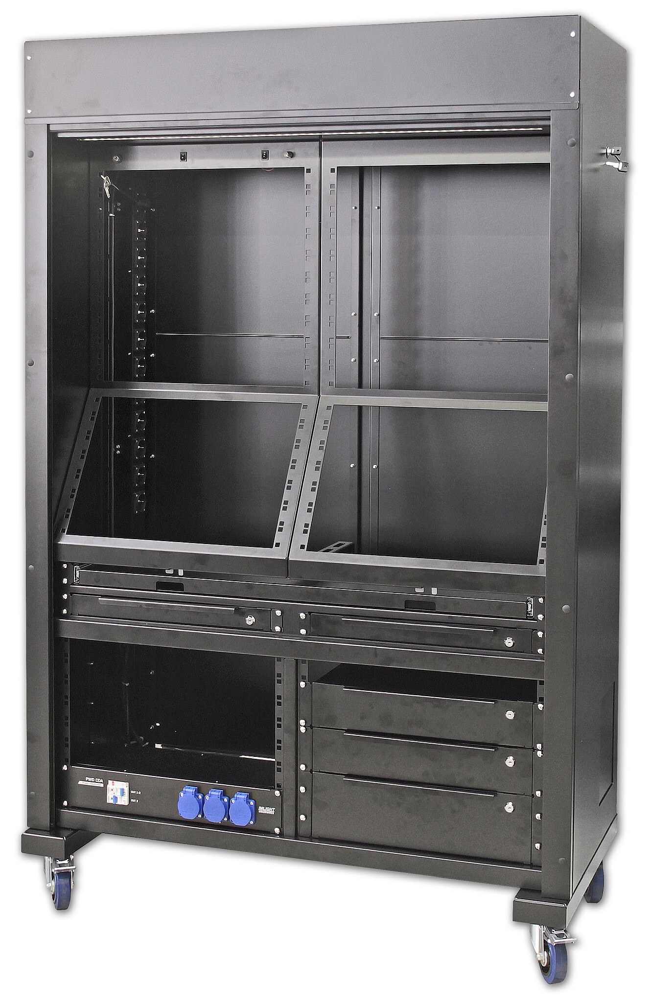 • 2U — средняя малая секция, размещена на высоте стандартной столешницы, верхний слот комплектуется выдвижной полкой 1U, в нижний слот рекомендуется устанавливать ящик 1U для сценариев ;