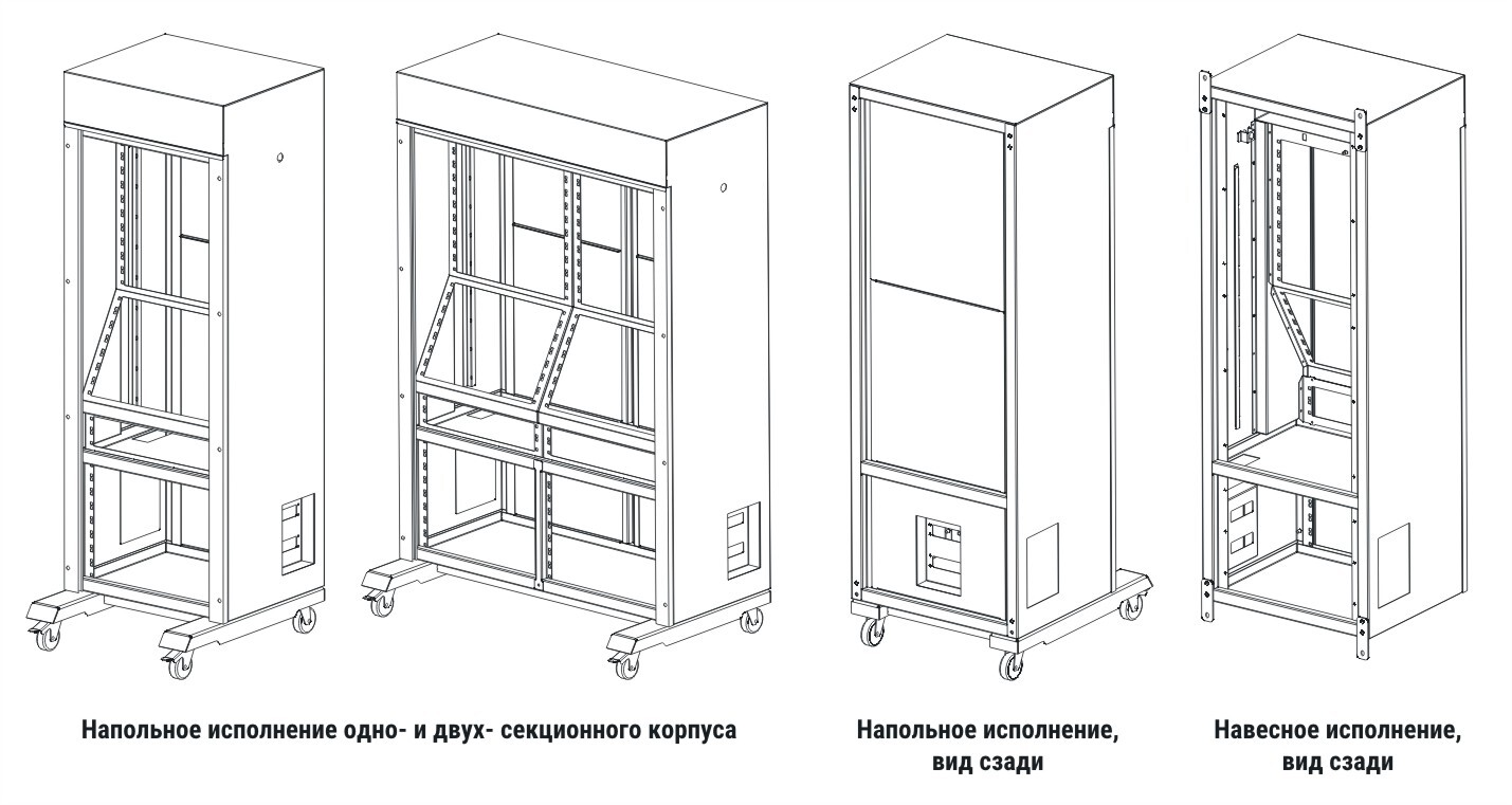 • 10U — верхняя утопленная секция, подходит для размещения мониторов и оборудования, требующего визуального контроля;