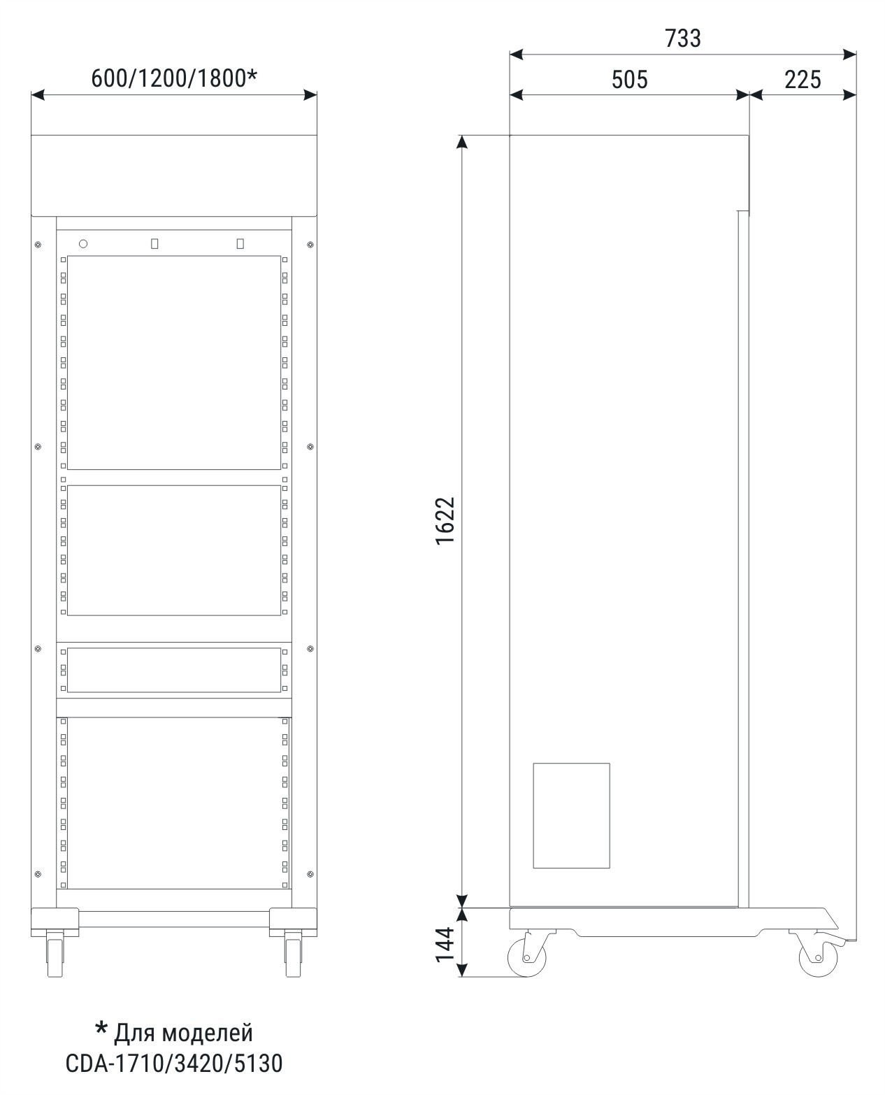 • 8U — нижняя секция, для оборудования, не требующего оперативного доступа и для выдвижных ящиков, нижние два слота занимает блок питания CDA PWD.