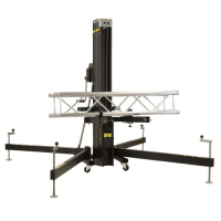 Универсальный элеватор фронтальной загрузки для линейных массивов, светодиодных экранов и ферм, с четырьмя секциями и возможностью блокировать на разной высоте, с индикатором уровня горизонтального положения, с транспортировочными колесами.
