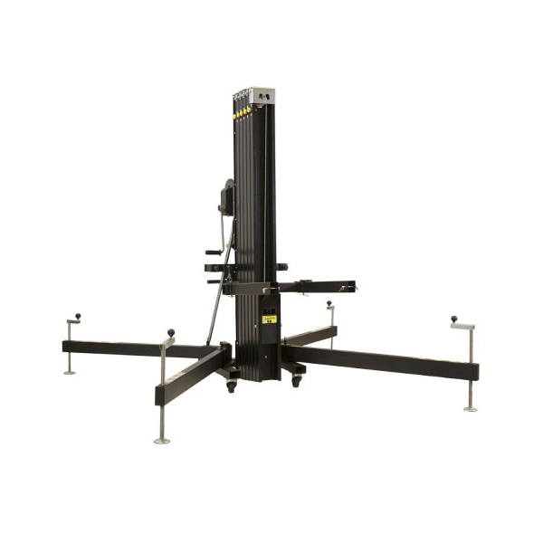 Универсальный элеватор фронтальной загрузки для линейных массивов, светодиодных экранов и ферм, с четырьмя секциями и возможностью блокировать на разной высоте, с индикатором уровня горизонтального положения, с транспортировочными колесами.
