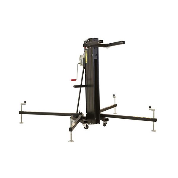 Универсальный элеватор фронтальной загрузки для линейных массивов, светодиодных экранов и ферм, с четырьмя секциями и возможностью блокировать на разной высоте, с индикатором уровня горизонтального положения, с транспортировочными колесами.