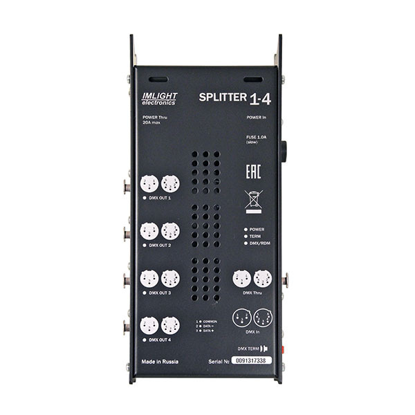 Блок разветвления/усиления сигнала DMX-512, 1 вход, 1 сквозной, 4 выхода, разъемы XLR 5pin, подключения питания разъем PowerCON, исполнение корпуса мобильное/настенное