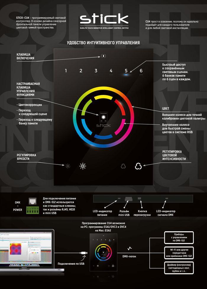 Концепция сенсорных панелей STICK – профессиональный контроллер световых приборов, органично вписанный в дизайн помещения, имеющий унифицированный и доступный для обычного пользователя интерфейс.