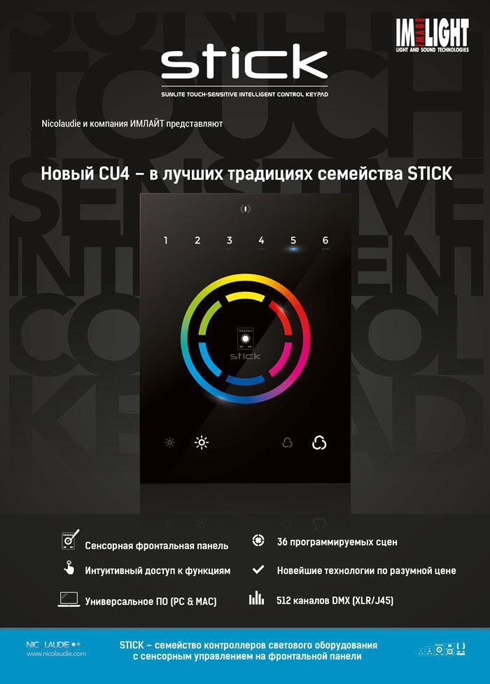 Компания Nicolaudie представила новую модель семейства STICK – контроллер CU4. В основе интерфейса – управление цветовой палитрой с помощью цветовых колёс, а также быстрый доступ к регулировке интенсивности и яркости светового потока. Схожее расположение органов управления используется в DE-3 – наиболее продвинутой модели в линейке STICK. В CU4 предусмотрена возможность быстрого доступа к сохранённым во внутренней памяти шоу: контроллер позволяет хранить и воспроизводить до 36 статичных или динамических сцен.