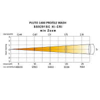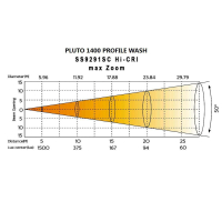 PLUTO 1400 PROFILE WASH HC (HI-CRI) — это супер мощный профессиональный светодиодный профильный прожектор, используемый как WASH светильник, с электронным линейным зумом 5°-50°. При мини-зуме освещенность на расстоянии 5 м достигает 48 600 люкс (HI-CRI) на источнике света 1200W LED Osram chip, CRI 96Ra, R9-95, CQS-92, TLCL-93, а сила света по центру луча 1 215 000 Кд. Да, сила света значительно меньше, чем на такой же модели на LED с CRI 72Ra, но тут выбор за пользователем, для ТВ студий показатель качества света более важен. Прибор может работать как очень сконцентрированный SPOT BEAM (без гобо) и как широкоугольная заливка WASH, особенно с применением 2-х независимых Frost фильтров (light / medium) с возможностью перекрытия друг друга. Точное позиционирование по осям X/Y. Блок профилирования луча состоит из 4-х моторизированных лезвий с поворотом +/- 45° и полным перекрытием луча одной шторкой. Система синтеза цвета CMY плюс отдельный линейный фильтр CTO коррекции цветовой температуры, а также 2 колеса с 6 яркими отдельными цветами и 2-мя отельными фильтрами CTO дают огромное разнообразие настройки цветовой палитры и удобство работы на современных системах управления. подстройка частоты мерцания LED до 25000 Гц, управление DMX512 / RDM / ArtNet/ SACN, Web-server для обновления системы.