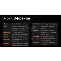 Встроенные студийные эффекты: мерцание свечи/огня; полицейские мигающие огни; вспышки молний; вечеринка и т.п.