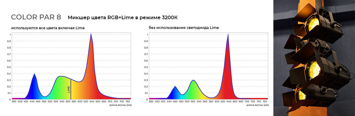 COLOR PAR 8 может использоваться как для цветной заливки, так и для классического белого освещения. В отличие от многих приборов такого формата COLOR PAR 8 отличается бесшумность в работе. Несмотря на наличие вентилятора COLOR PAR 8 абсолютно бесшумный. Качественная оптика даёт максимальную яркость и однородное смешение цветов. Прибор хорошо подходит для замены ламповых приборов. Новый функционал позволяет настроить цветовую температуру освещения в режиме RGB+ или HS+, сохраняя при этом высокое качество освещения. Это происходит за счет участия всех цветов в источнике прибора — красного, зеленого, синего и лаймового.