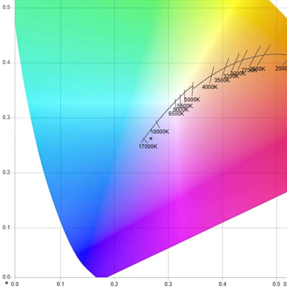 | Координата цветности [CIE 1931] (ГИ) | x = 0.2675 y = 0.2621 | |
