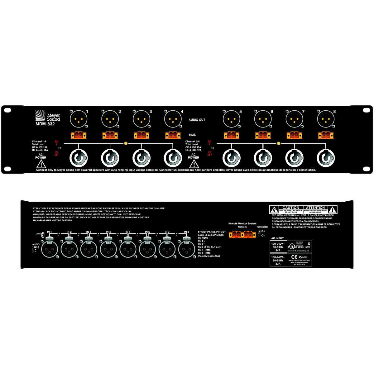 Модуль распределения для объединения и маршрутизации питания переменного тока, балансного аудио и RMS-подключения к акустическим системам Meyer Sound.