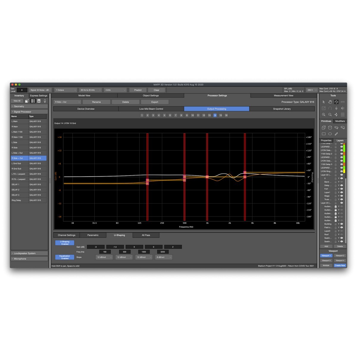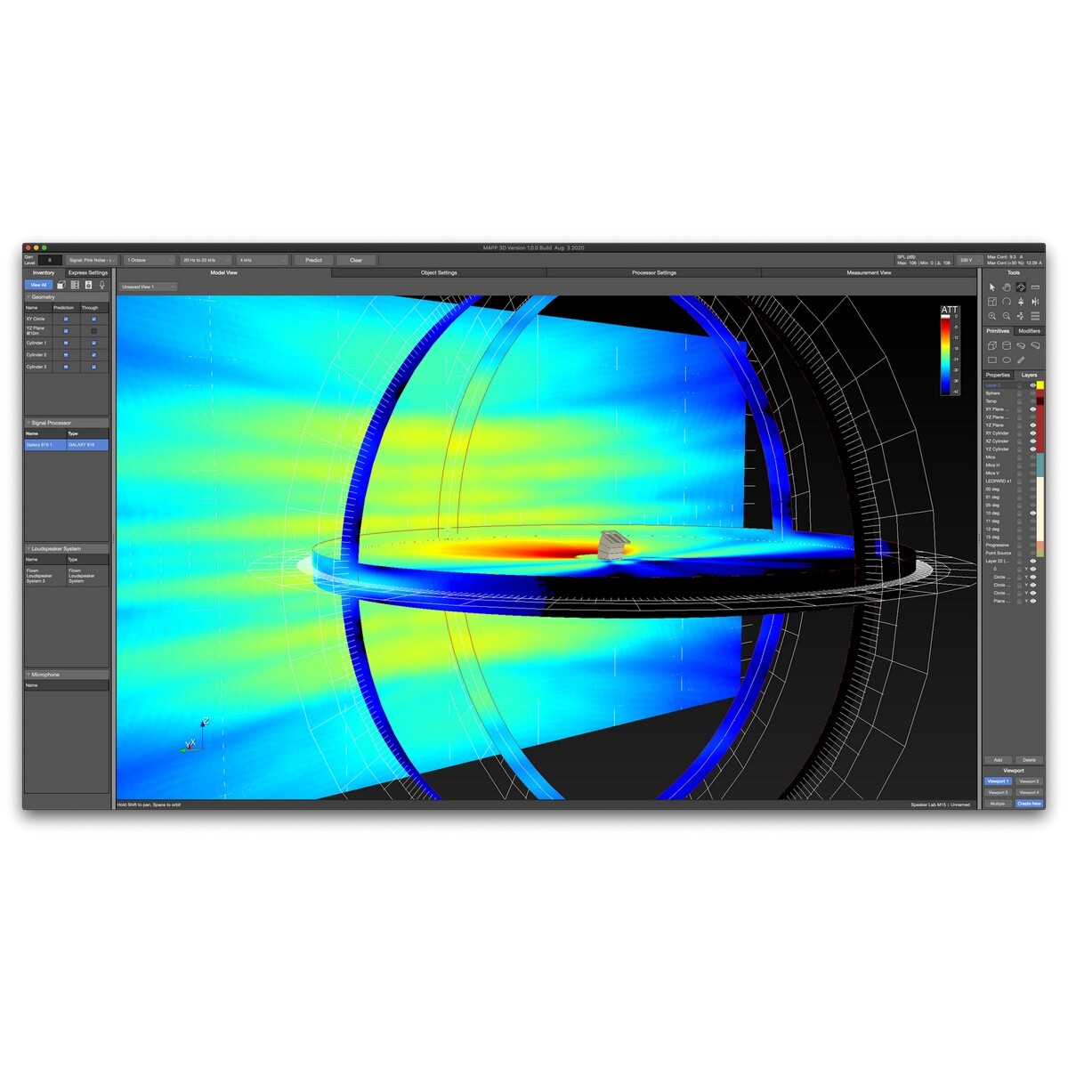 Среди возможностей MAPP 3D — конфигурация направленных низкочастотных систем, автоматический расчет углов элементов линейных массивов, различные параметры представления измерений, поддержка разных типов тестового сигнала (M-noise) и многое другое.