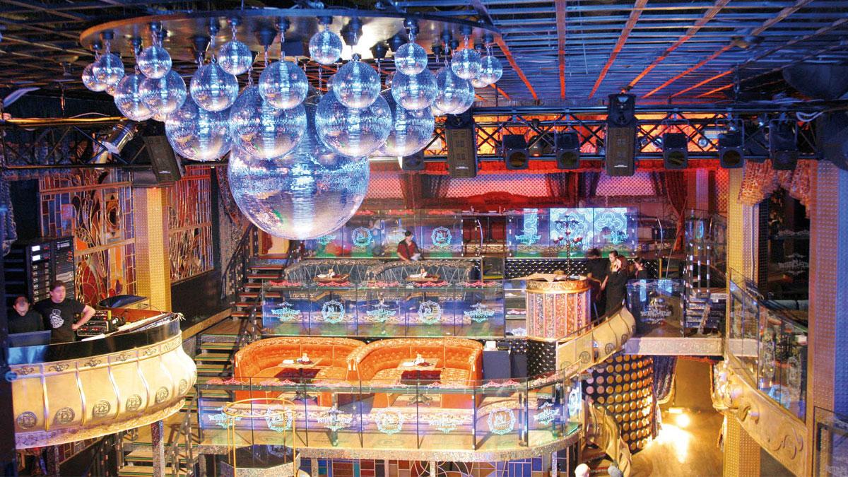 В центре зала приковывала к себе внимание громадная люстра, состоящая из множества зеркальных шаров различного диаметра, амфитеатр с барами, оформленными коваными люстрами и подсвечниками, по периметру клуба расположились ложи с отделкой под золото. Огромные картины в дорогих багетах, выполненные в стиле «vintage» и расположенные на различных уровнях, создавали эффект роскоши и великолепия.