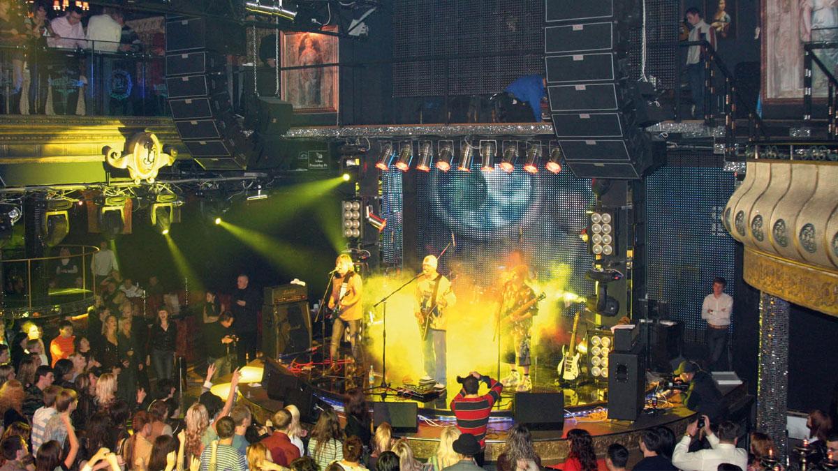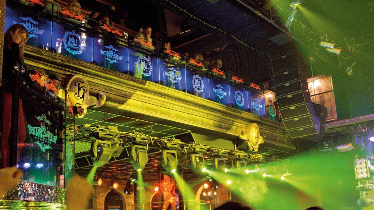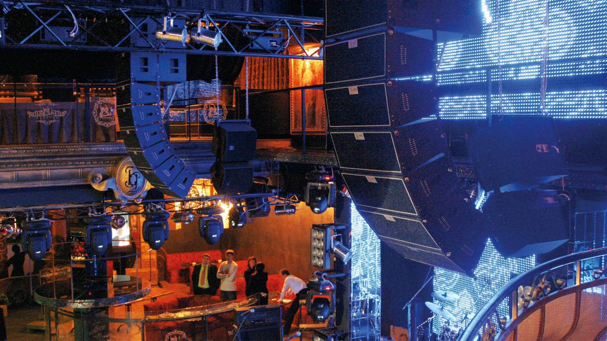 Точка привлечения внимания, зона развития всех шоу – многоуровневая сцена со светодиодным экраном, которую венчала огромная алюминиевая конструкция с большим количеством световых интеллектуальных приборов. Обрамляли сцену кластеры акустических систем. Иллюзию живого огня можно было ощутить, взглянув на экраны плазменных панелей, широко используемых в клубе.