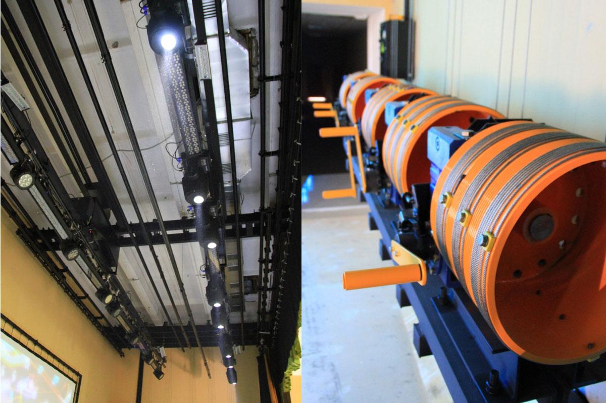 В основе верхней машинерии сцены – беспротивовесные софитные и декорационные подъёмы, оснащённые ручными лебёдками — система, позволяющая, недогружая противовес, поднять софит на нужную высоту. Основной лобовой свет обеспечивает выносной софит. Боковой свет обеспечивают поплановые световые прострелы.