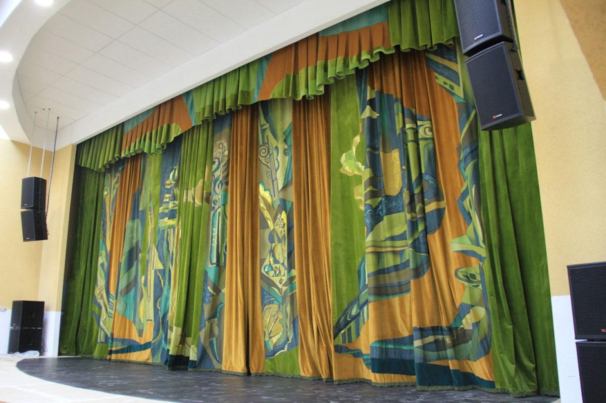 | Особенности проекта | Осуществлен монтаж металлоконструкций над сценой для размещения технологического оборудования – механика сцены, световое и звуковое оборудование Комплекс оборудования постановочного освещения полностью построен на базе энергосберегающих светодиодных приборов (LED-технологии) Полноценный выносной софит в зале, несмотря на отсутствие технологического пространства над ним, для подключения оборудования Система звукоусиления предназначена для работы на различных типах мероприятий, обеспечивающая равномерное озвучивание всех зон зрительских мест Широкоформатный проекционный экран на задней стене сцены для кино-показов Антрактно-раздвижной занавес ручной работы по индивидуальному художественному решению Техника исполнения: «холодный» батик и свободная роспись шёлка |