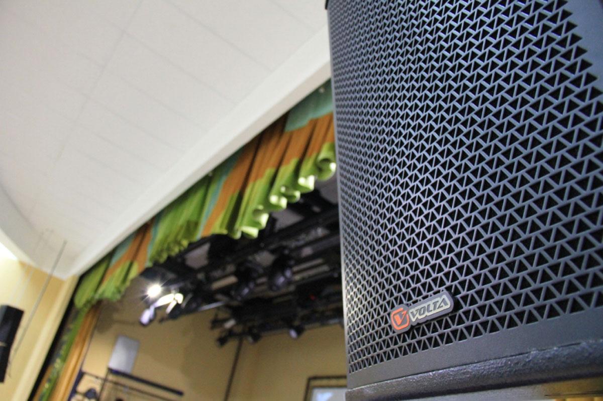 Звукоусилительный комплекс зала представлен широкополосными и низкочастотными акустическими системами классического исполнения производства Volta. Это отличное бюджетное решение, при том, что оборудование обладает достойным качеством и высокой надёжностью работы. Звуковой комплект включает в себя и другие необходимые компоненты системы – проводные и беспроводные микрофоны, микшерный пульт, источники сигнала и приборы обработки.
