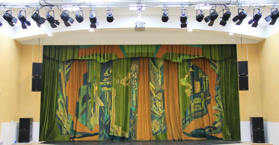 | Особенности проекта | Осуществлен монтаж металлоконструкций над сценой для размещения технологического оборудования – механика сцены, световое и звуковое оборудование Комплекс оборудования постановочного освещения полностью построен на базе энергосберегающих светодиодных приборов (LED-технологии) Полноценный выносной софит в зале, несмотря на отсутствие технологического пространства над ним, для подключения оборудования Система звукоусиления предназначена для работы на различных типах мероприятий, обеспечивающая равномерное озвучивание всех зон зрительских мест Широкоформатный проекционный экран на задней стене сцены для кино-показов Антрактно-раздвижной занавес ручной работы по индивидуальному художественному решению Техника исполнения: «холодный» батик и свободная роспись шёлка |