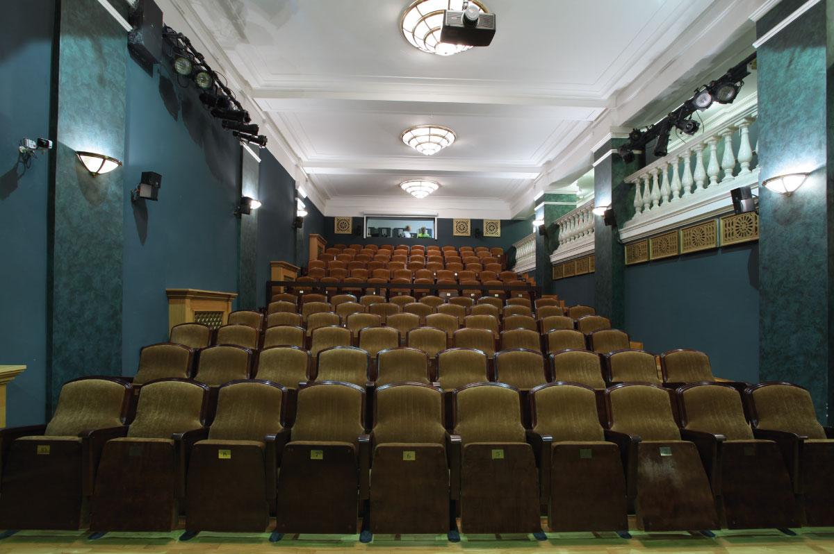 Второй зал – «Рубиновый» универсален и позволяет устраивать творческие встречи, мини-постановки и фуршеты. Система постановочного освещения реализована на LED-приборах компании Silver Star. Приборы распределены по всему периметру зала, отдельно подсвечивается даже потолок, ступени и галереи. Имеется система видеопроекции, мобильная система звукоусиления и несколько точек для подключения режиссёрского пульта.