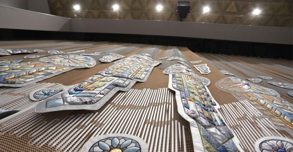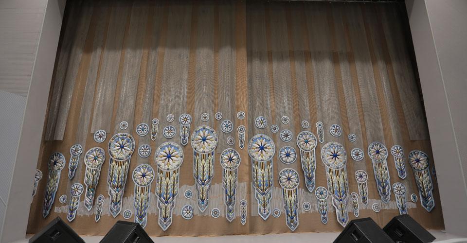 Одежда сцены также изготовлена под заказ - особым украшением занавеса стала вышивка серебряными нитями в виде кольчуги. Следует отметить, что расположение в самом центре Москвы внесло ряд ограничений во время реализации проекта. Одно из них - жёсткий лимит на электроэнергию, поэтому основой светового комплекта стало светодиодное оборудование торговых марок D.T.S. и Silver Star.