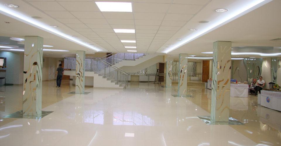 Многоуровневая конструкция потолков и большое количество зеркальных поверхностей позволили зрительно увеличить вестибюль, а плавно разливающиеся световые потоки, отраженные от блестящей плитки пола, вместе с торжественным ожиданием чего-то грандиозного создают ощущение тепла и уюта.