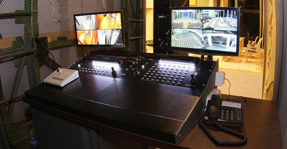 Для управления комплексом постановочного освещения пультовую оборудовали английской консолью управления светом HES, возможности которой обеспечивают максимальную оперативность управления любым комплектом светового оборудования, медиасерверами и приборами Digital Lighting.