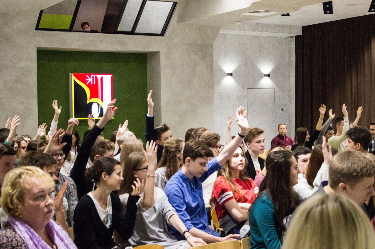 В этом году КЭПЛ исполнилось 25 лет. Обсуждая идею подарка, мы поняли, что хотим преподнести что-то для всех – и для лицеистов, и для педагогов, и для родителей. Так было решено сделать наш актовый зал более современным, способным технически обеспечивать не только развлекательные, но и научно-практические мероприятия, то есть по сути переформатировать типовой актовый зал в многозадачный конгресс-холл. Считаю, что с воплощением этой идеи мы справились. Новый зал получился на самом деле многофункциональным, залом-трансформером. В проекте предусмотрены не только специальные отсеки для хранения конференц-мебели, но и профессиональное постановочное освещение и звукоусиление, позволяющее «перепрофилировать» рабочее пространство под различные задачи.