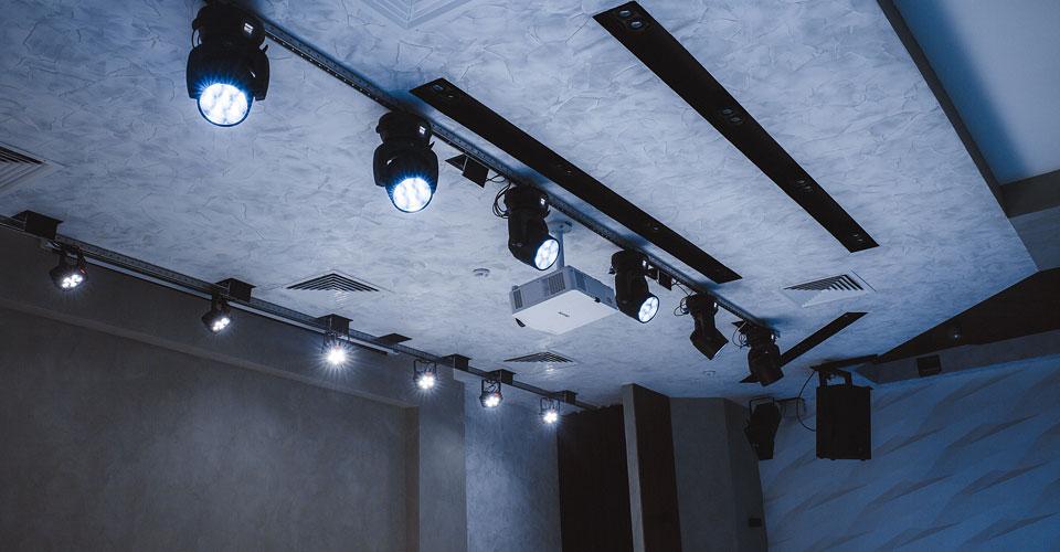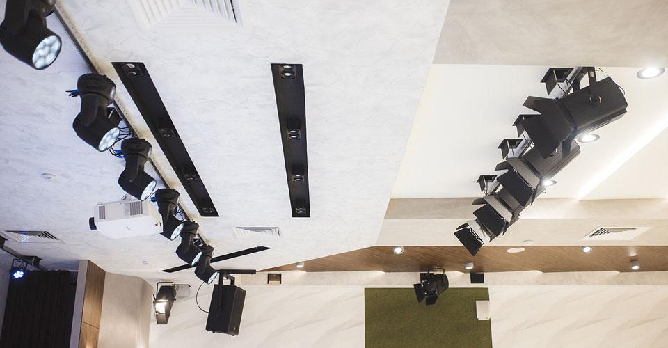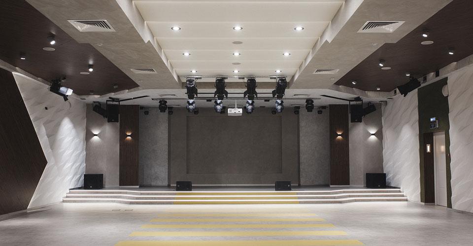 В светотехническом проекте конгресс-холла в первую очередь реализована задача трансформации света и взаимодействия сценического света с основным (основной свет реализован на множестве точечных светильников). Так, сценическое пространство оборудовано приборами, отвечающими за лобовое освещение, необходимое для работы светооператора с общими планами. Эффектный свет построен на wash-прожекторах и контровой линейке par-светильников STAGE 4. Поскольку конгресс-холл планируется активно использовать и как площадку для концертных и театральных постановок, в подборе приборов (особенно приборов выносного света) для проекта мы учитывали возможность формирования угла и формы луча, чтобы можно было высвечивать отдельные декорации, создавать мизансцены.