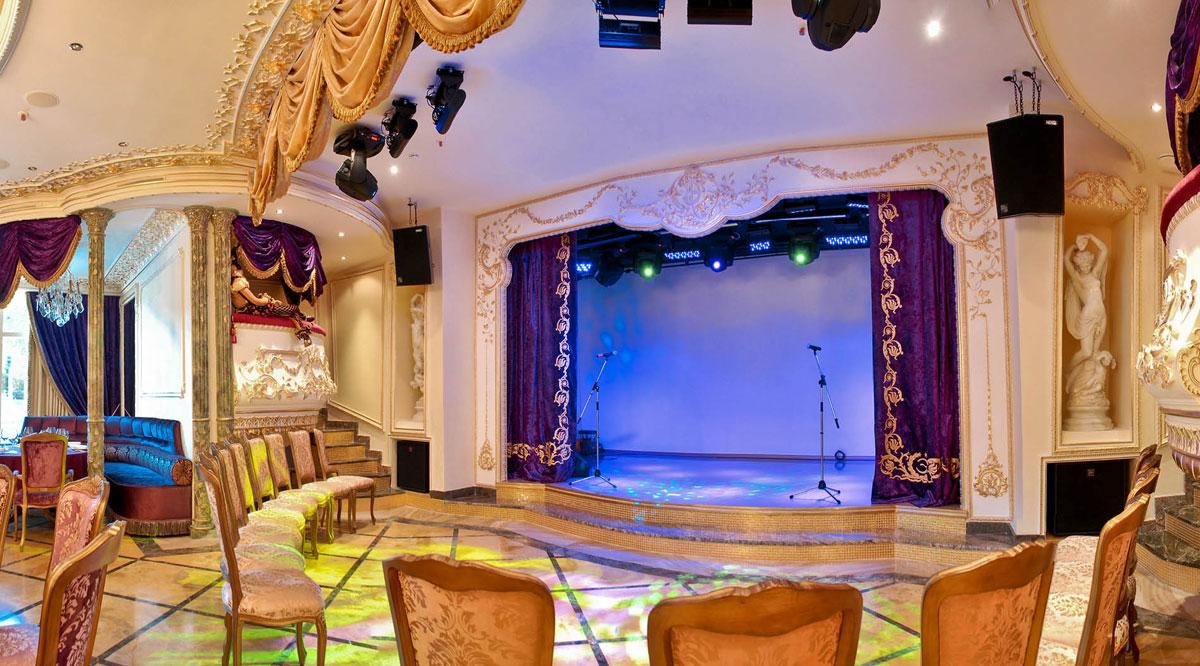 Для зала столь небольшой площади звук был поставлен с запасом: две акустические системы мощностью 1200 Вт и два сабвуфера с пиковой мощностью 3600 Вт, размещенные в нишах под мраморными скульптурами, что, безусловно, улучшило качество басовой составляющей. На сцене предусмотрена одна мониторная линия с двумя сценическими мониторами. Поскольку от консоли к сцене проложены аналоговые мультикоры, выведенные в лючки на сцене, количество мониторных линий в любой момент может быть увеличено.