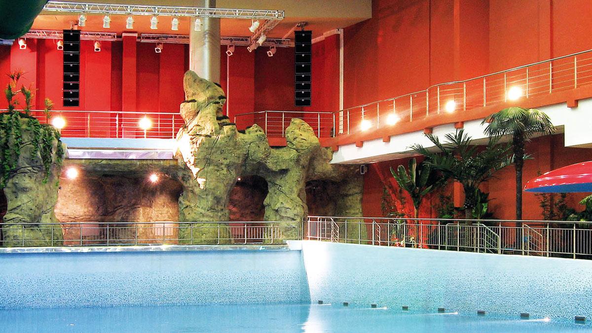 Аквапарк – достаточно специфический объект, и не только потому, что их не так много, как эстрадных площадок, театров и, тем более, клубов, а ещё и потому, что технические задачи необходимо решать в условиях повышенной влажности. Сложность проекта заключалась именно в подборе звукового и светового оборудования с максимальным коэффициентом IP, характеризующим степень защиты приборов от условий окружающей среды, а также обеспечение проведения на этом оборудовании таких мероприятий, как концерты и дискотеки.