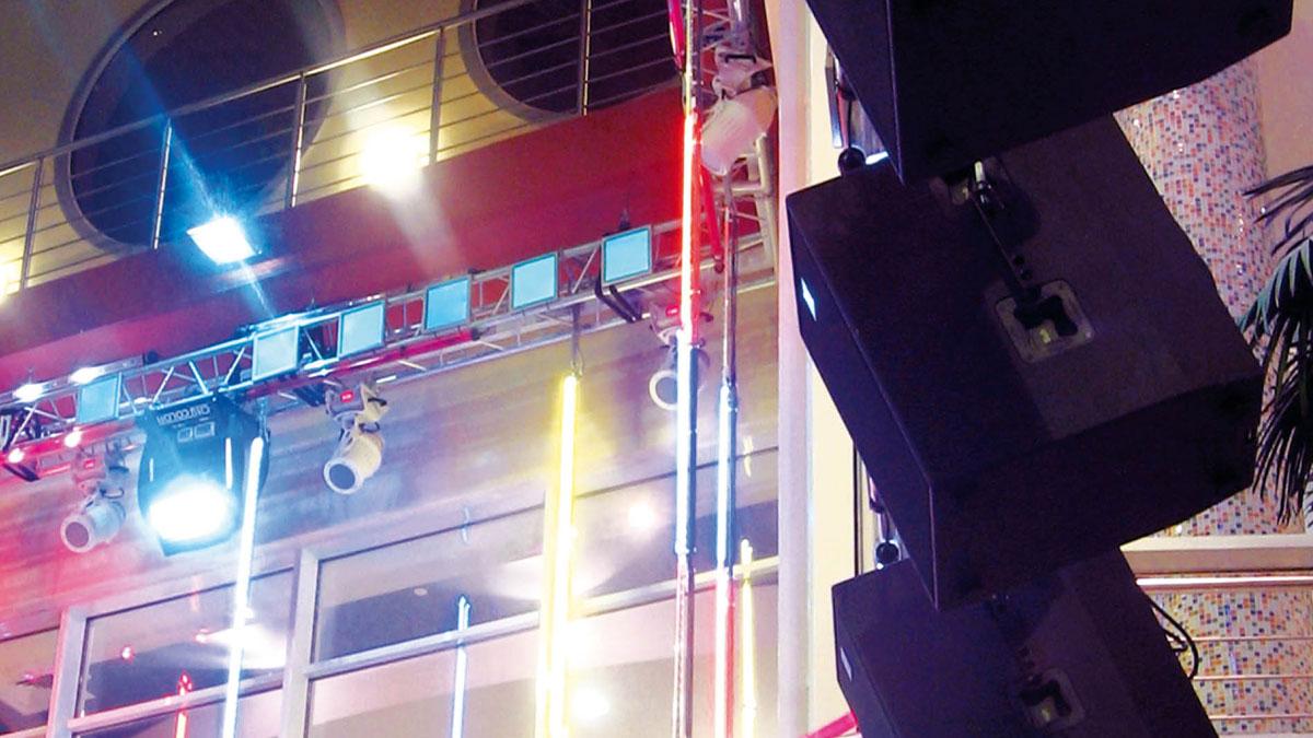 Фактически, звуковой комплекс построен из двух независимых акустических комплектов. На сцене смонтирован мини линейный массив, а зону танцпола озвучивают АС серии Compact. В целом весь звуковой комплекс имеет возможность работы в 2-х основных режимах: дискотека – и тогда работают АС серии Compact на танцпол без участия сценической площадки, и концерт, когда основное звучание обеспечивает мини линейный массив, а Compact через линии задержки выполняют функцию подзвучки, обеспечивая тем самым более чёткую разборчивость звучания комплекса в целом.