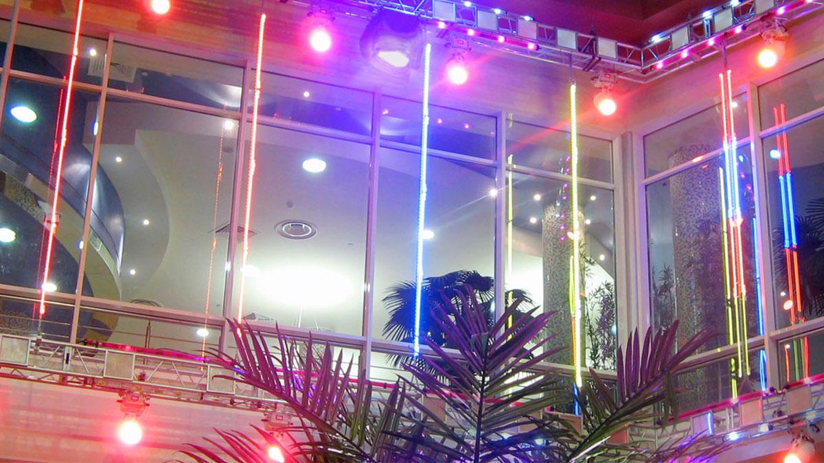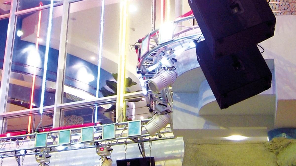 Именно этот фактор наложил существенные ограничения на применение традиционно используемых в таких случаях приборов с движением луча («головы», сканеры). Кроме того, аквапарк – это еще и высокие потолки, плохая естественная акустика и высокий уровень шума. Танцевальная площадка со слушателями находится на большом удалении от сцены (около 50 метров).