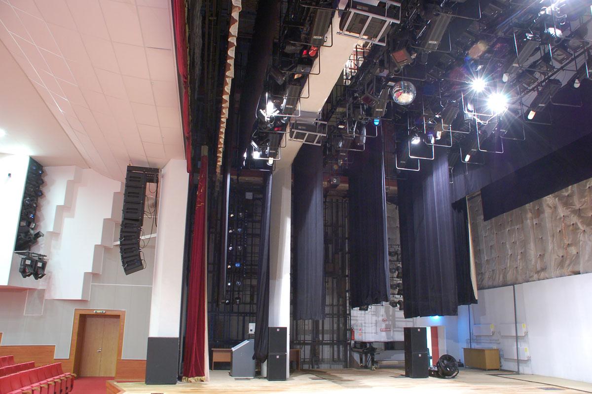 | Особенности проекта | 1. Разноплановость проводимых мероприятий – от конференций, съездов и концертов до театральных постановок 2. Высокие требования к новому технологическому оснащению театра. После реконструкции театр должен перейти на качественно новую ступень технологического развития 3. Нестандартная, совершенно не театральная архитектура зала и сцены, включая нестандартные размеры зеркала сцены 15 х 6,6 м. Софитные подъемы имеют длину 15 м, на которых установлено различное разнопрофильное световое оборудование общей массой около 2 т. Для решения этой задачи были изготовлены нестандартные софитные фермы и лебедки, установлены двойные угловые балки и усиленные блоки 4. Наличие под зданием действующей линии метро, что снижает несущую способность фундамента и стен. Для решения задачи была изготовлена уникальная система гашения кинетической энергии противовесов дымовых клапанов, усилена система технологических конструкций 5. Жесткий лимит имеющихся электрических мощностей, присущий большинству мегаполисов. Решением задачи послужило масштабное применение приборов с высокоэффективными оптическими системами и малым потреблением электроэнергии, использование электронных пуско-регулирующих устройств, LED-источников света, ламп с повышенной светоотдачей, энергосберегающих технологий 6. Требования к универсальности зала определили выбор линейного массива Х-Treme в качестве основы звукоусилительного комплекса. Применение линейного массива позволяет получить контролируемую вертикальную и широкую горизонтальную направленность. Для высвобождения сценического пространства акустические системы линейного массива, включая сабвуферы, расположены вне зеркала сцены |