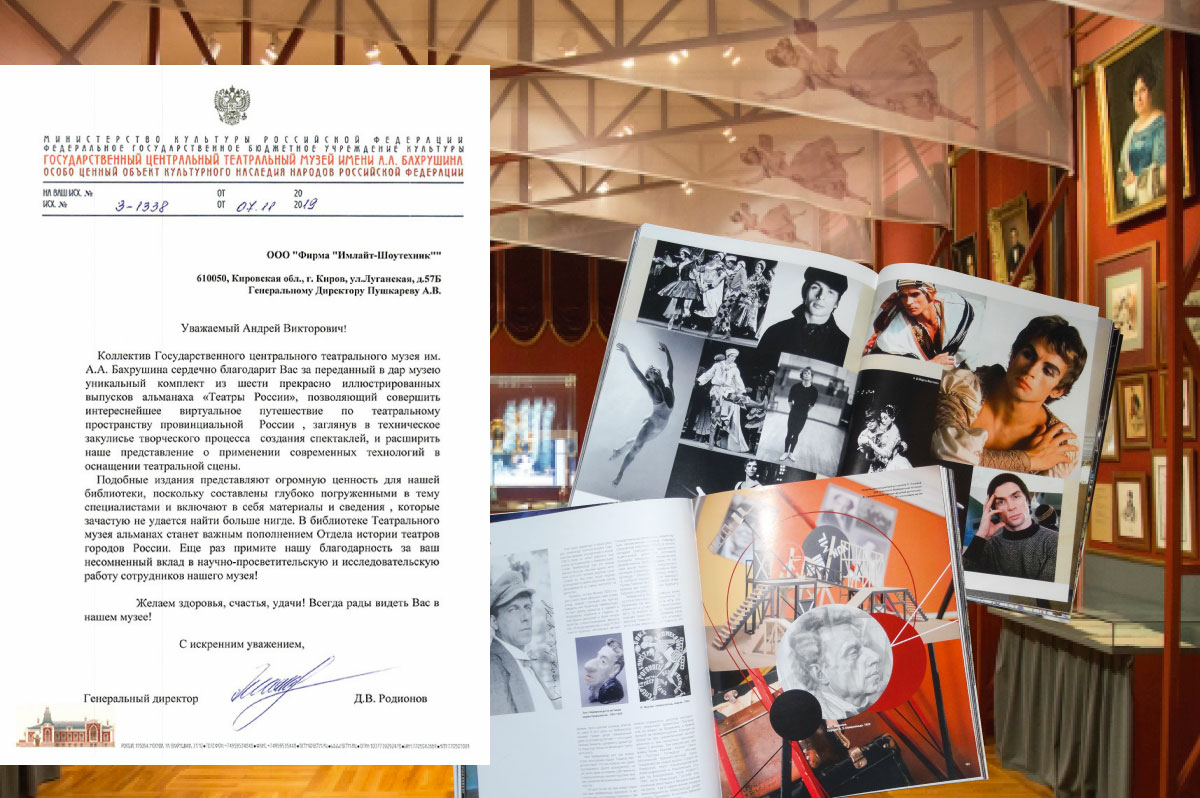Мы рады получить высокую оценку своей работы от главного хранителя театральной истории страны - Государственного центрального театрального музея имени А.А. Бахрушина. В коллекции музея хранится больше 1,5 миллионов уникальных экспонатов, в которых живет более чем вековая история театральной России. Сегодня в фондах Бахрушинского музея есть и вся серия опубликованных альманахов «Театры России», на страницах которой нашла свое отражение история театров Кирова, Тобольска, Астрахани, Саранска, Уфы, Пензы.
