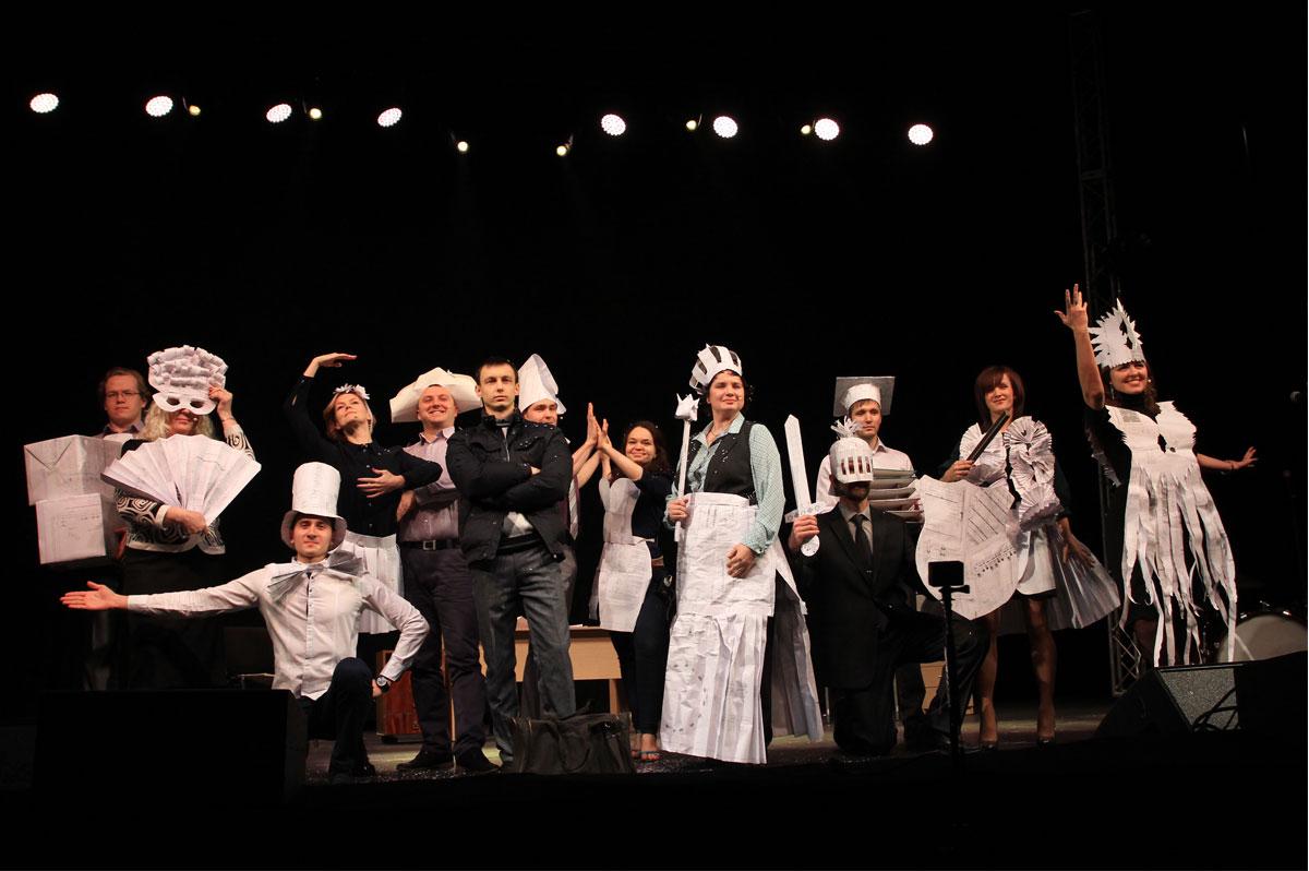 Оперный хит проектного отдела с рефреном «Проектный отдел – всегда горы дел» сейчас знают все. Джоаккино Россини, сочиняя увертюру к опере «Сорока-воровка», и не подозревал о таких крайностях. Хотя… Момент истины во время репетиций наступил, когда все стали придумывать бумажные костюмы из чертежей. В арт-оригами оделись амазонки, принцессы, рыцари, арлекины, королевы, шуты, придворные дамы, наполеоны, балерины, - смешно и красиво! И ещё все, конечно, будут помнить короткую, но коварную скороговорку, которую нужно было повторять по несколько раз перед репетициями: «Король-орёл». Вариантов произношения была бездна…