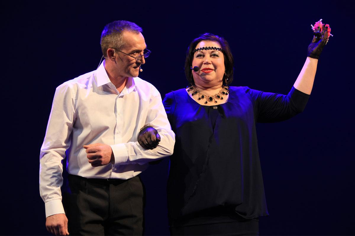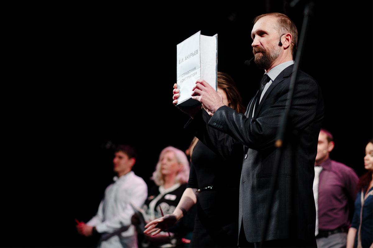 Конферанс вели Елена Пислегина, Андрей Мошонкин и Сергей Колтун. Неподражаемая Елена Васильевна (по сценарию Муза Васильевна) отвечала за вдохновение артистов за кулисами. Андрей и Сергей в течение вечера вспоминали историю компании, рассказывая о театральном прошлом, объясняя всё происходящее на сцене творческими генами коллектива.