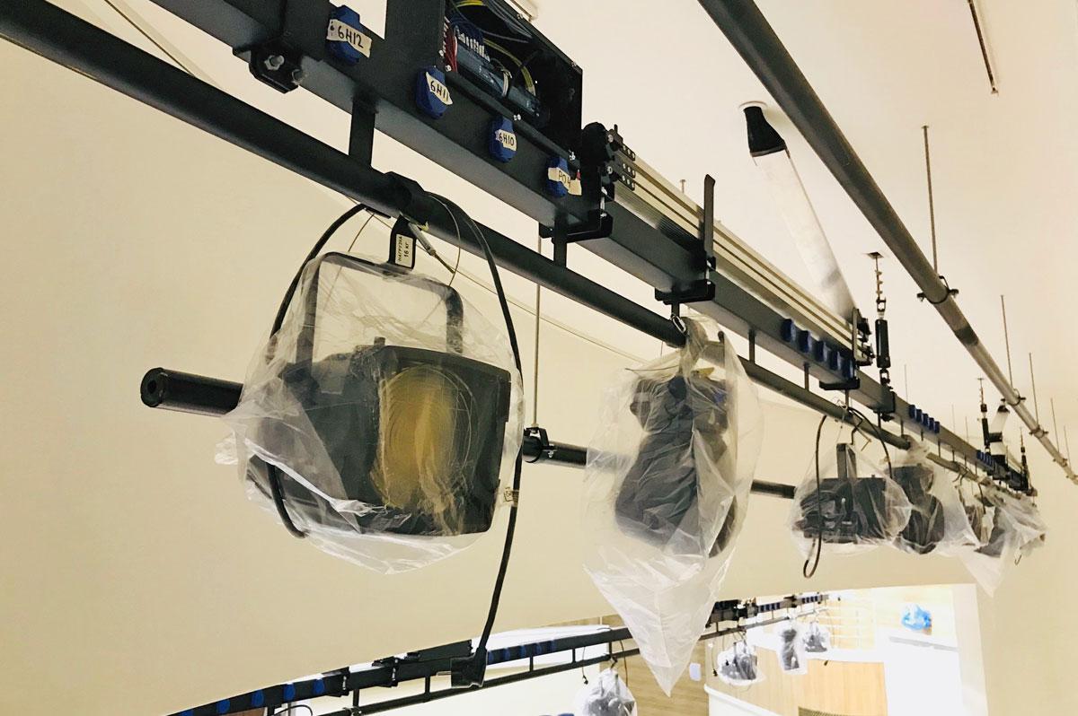 В составе световых подъемов используется новая разработка ТМ IMLIGHT – складной алюминиевый шлейф (функционально он заменил традиционную корзину для кабеля), внутри которого заложена коммутация для оборудования на софите. Высота нового шлейфа (в размерах под проектные решения именно этой площадки) в сложенном виде составляет всего 15 см. Это компактное и эстетичное решение позволяет экономить пространство, что актуально для небольших залов с дефицитом высоты коробки сцены.