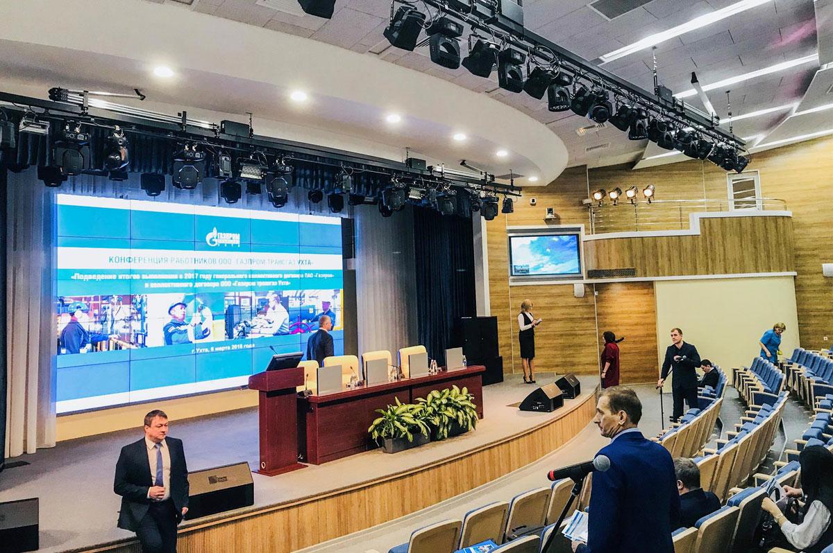 Актовый зал новой штаб-квартиры «Газпром трансгаз Ухта» на проспекте Газовщиков – это уже вторая сценическая площадка, реализованная компаниями «Имлайт» и «Музмир-Инжиниринг» для крупнейшего поставщика природного газа в Северо-Западном регионе. Первый объект, расположенный по адресу прежней прописки предприятия, был сдан в 2009 году, и, к слову, многие проектно-инсталляционные решения этого зала и сегодня остаются актуальными.