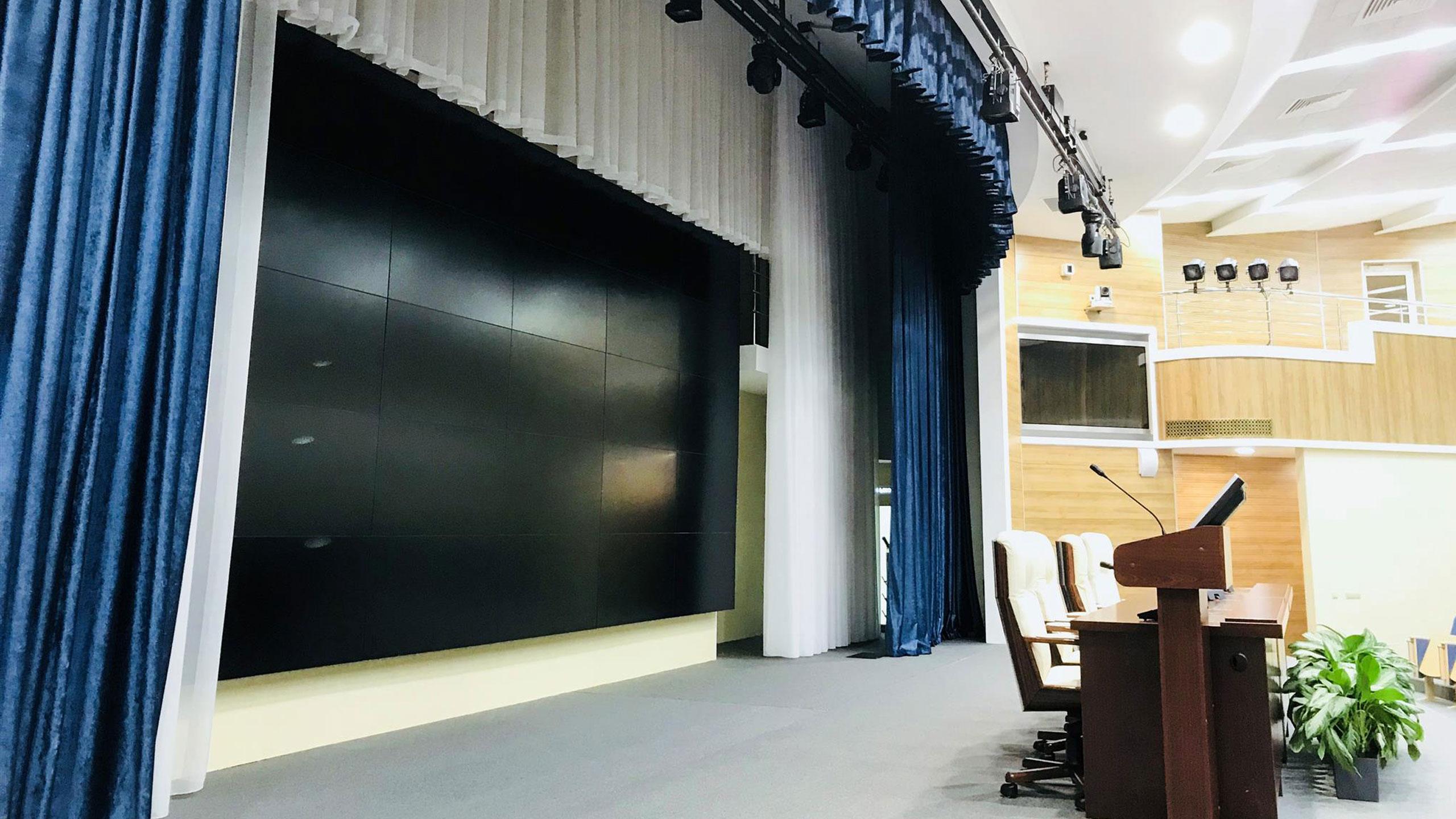 Так, глубина актового зала на 260 зрительных мест составляет порядка 15 метров, переменная ширина зала – 24 метра. Сцена оборудована 15-метровой радиальной дорогой антрактно-раздвижного занавеса (одна из новых разработок TM IMLIGHT), радиальным стационарным арлекином, двумя стационарными штанкетами, дорогой попланового занавеса с электроприводом и тремя софитными подъемами (на сцене, над авансценой и выносным в зале), каждый из которых снабжен складным алюминиевым шлейфом – нашей новой разработкой.