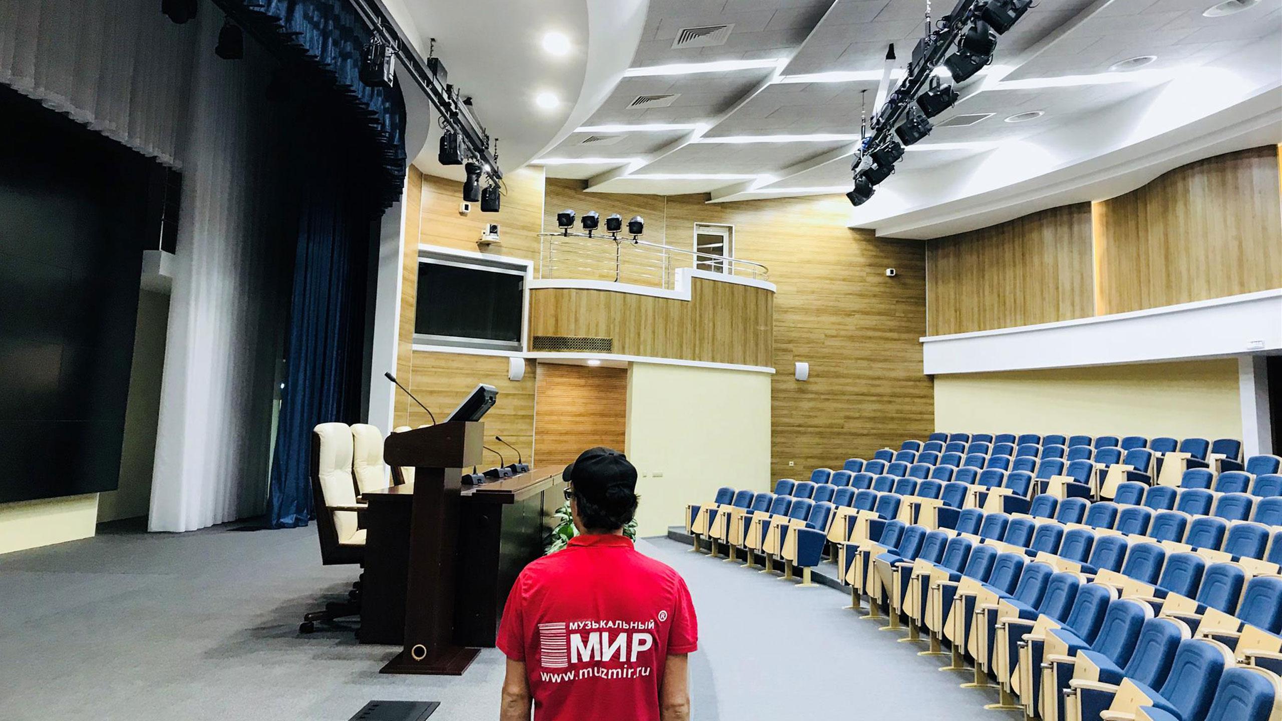 Весь цикл монтажных и пуско-наладочных работ на этом объекте мы провели за 24 рабочих дня. В середине марта актовый зал «Газпром трансгаз Ухта» был сдан заказчику с готовым действующим технологическим комплексом. Инсталляционный проект сценической площадки вписан в ультрасовременную концепцию здания, возведенного с учетом самых последних проектировочных решений в области строительства административно-офисных объектов (огромные площади, грамотные и функциональные планировки рабочих и общественных зон, современные материалы и оборудование). Площадка конференц-зала также соответствует высокому уровню – и по проектным решениям, и по составу оборудования: высокотехнологичный комплект верхней механики с системами управления, светотехнический парк, позволяющий проводить не только официальные, но и концертные мероприятия. А благодаря применению современных строительных акустических материалов и, конечно, грамотной инсталляции звукового комплекта, зал имеет прекрасные акустические характеристики.