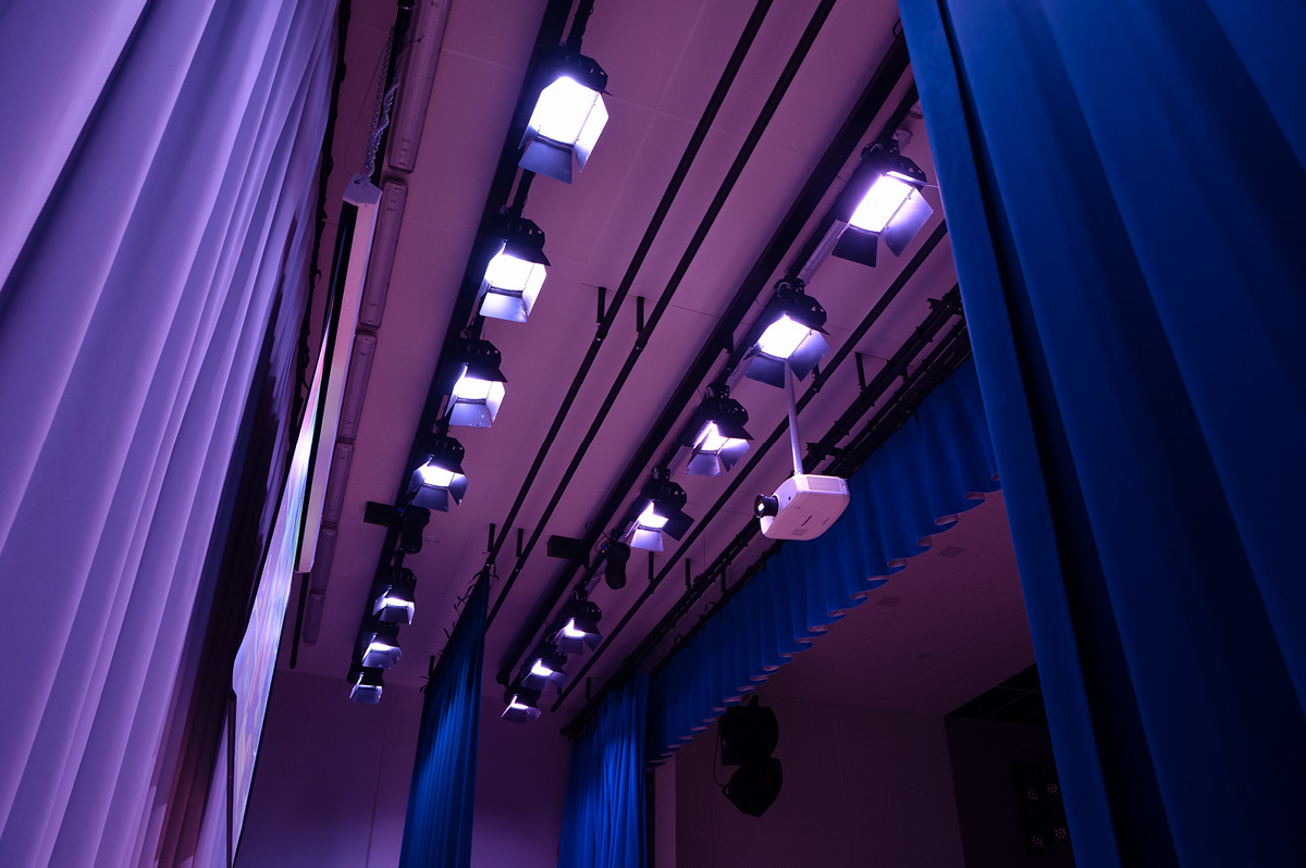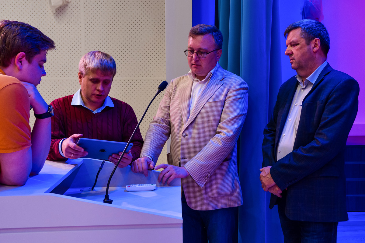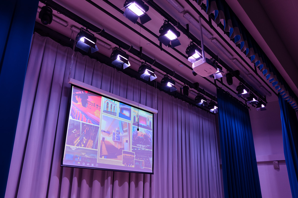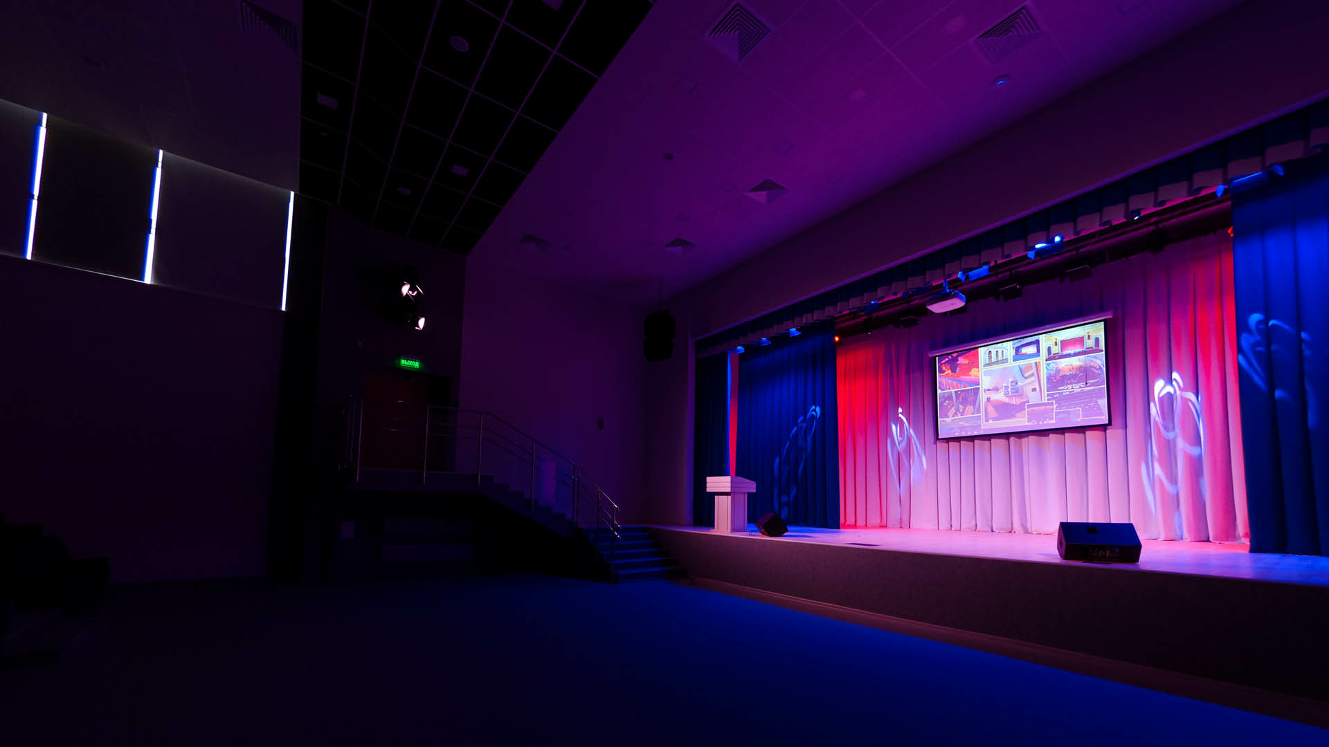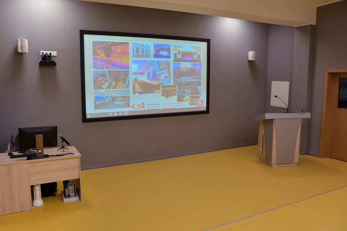 В проекте были использованы системы управления театрально-технологическими системами актового зала и мультимедийного центра, позволяющие управлять освещением, затемнением окон, приводами экранов и антрактно-раздвижного занавеса, причем как со стационарных пультов, так и с планшета или смартфона со специально установленным ПО.