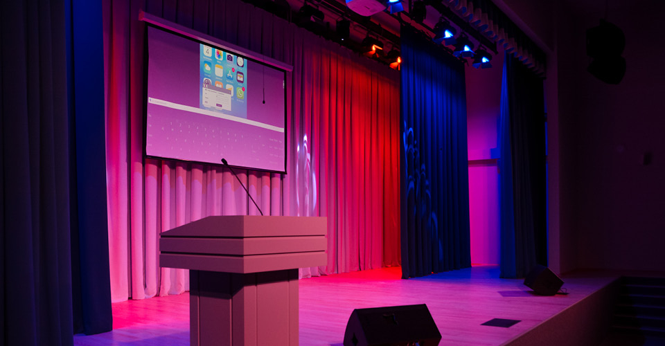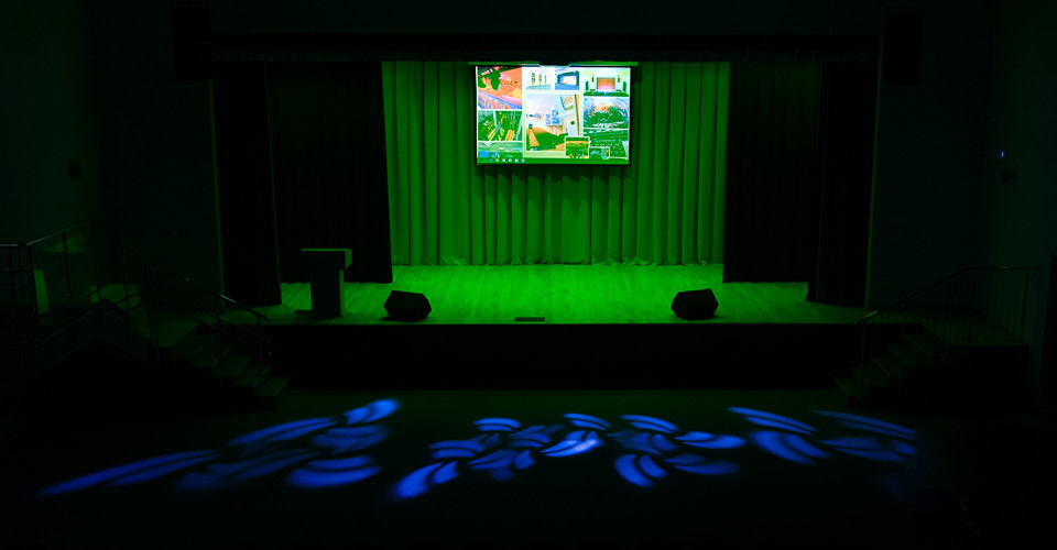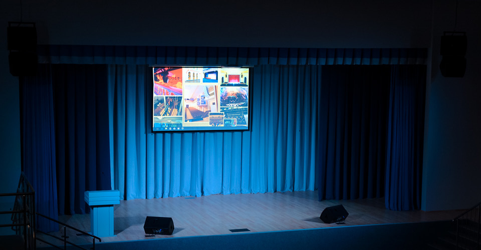 В проекте были использованы системы управления театрально-технологическими системами актового зала и мультимедийного центра, позволяющие управлять освещением, затемнением окон, приводами экранов и антрактно-раздвижного занавеса, причем как со стационарных пультов, так и с планшета или смартфона со специально установленным ПО.