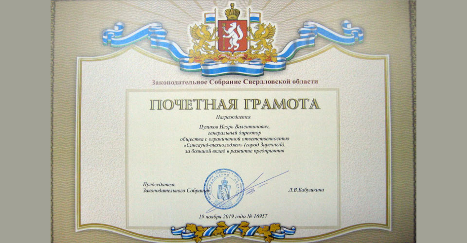 Партнер «Имлайт» в Екатеринбурге вновь отмечен на высоком региональном уровне. 11 декабря генеральный директор «Синсаунд-технолоджи» Игорь Пуликов получил Почетную грамоту Законодательного Собрания Свердловской области. Награждение происходило на ежегодном совещании директоров культурно-досуговых учреждений, приуроченном к празднованию 90-летия Свердловского государственного областного Дворца народного творчества.