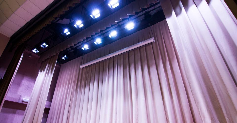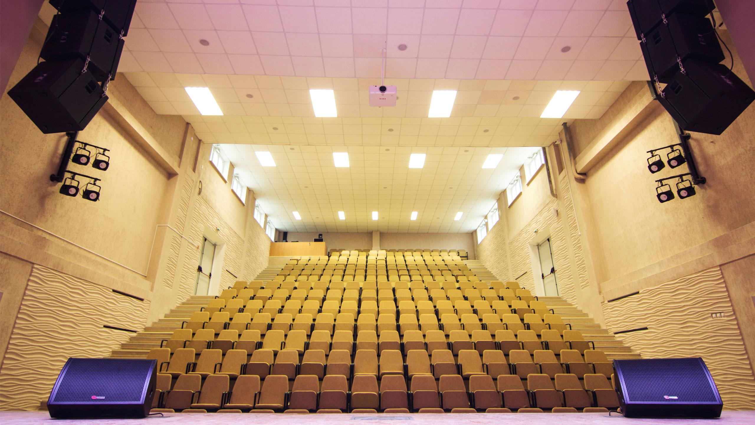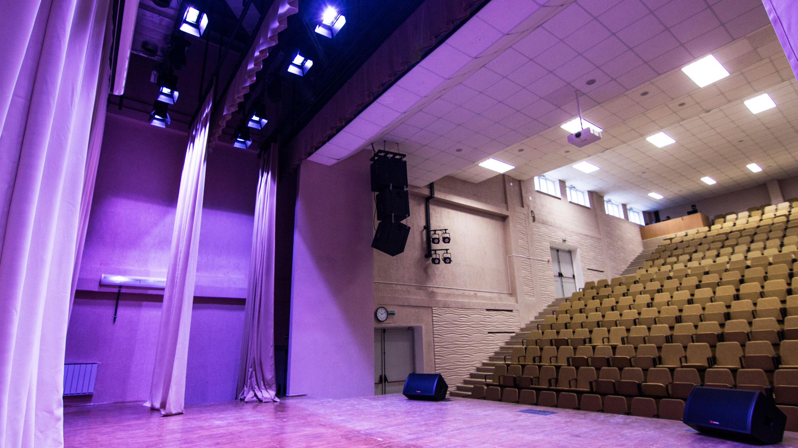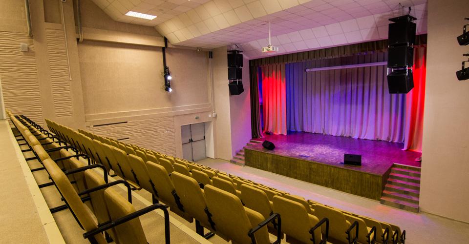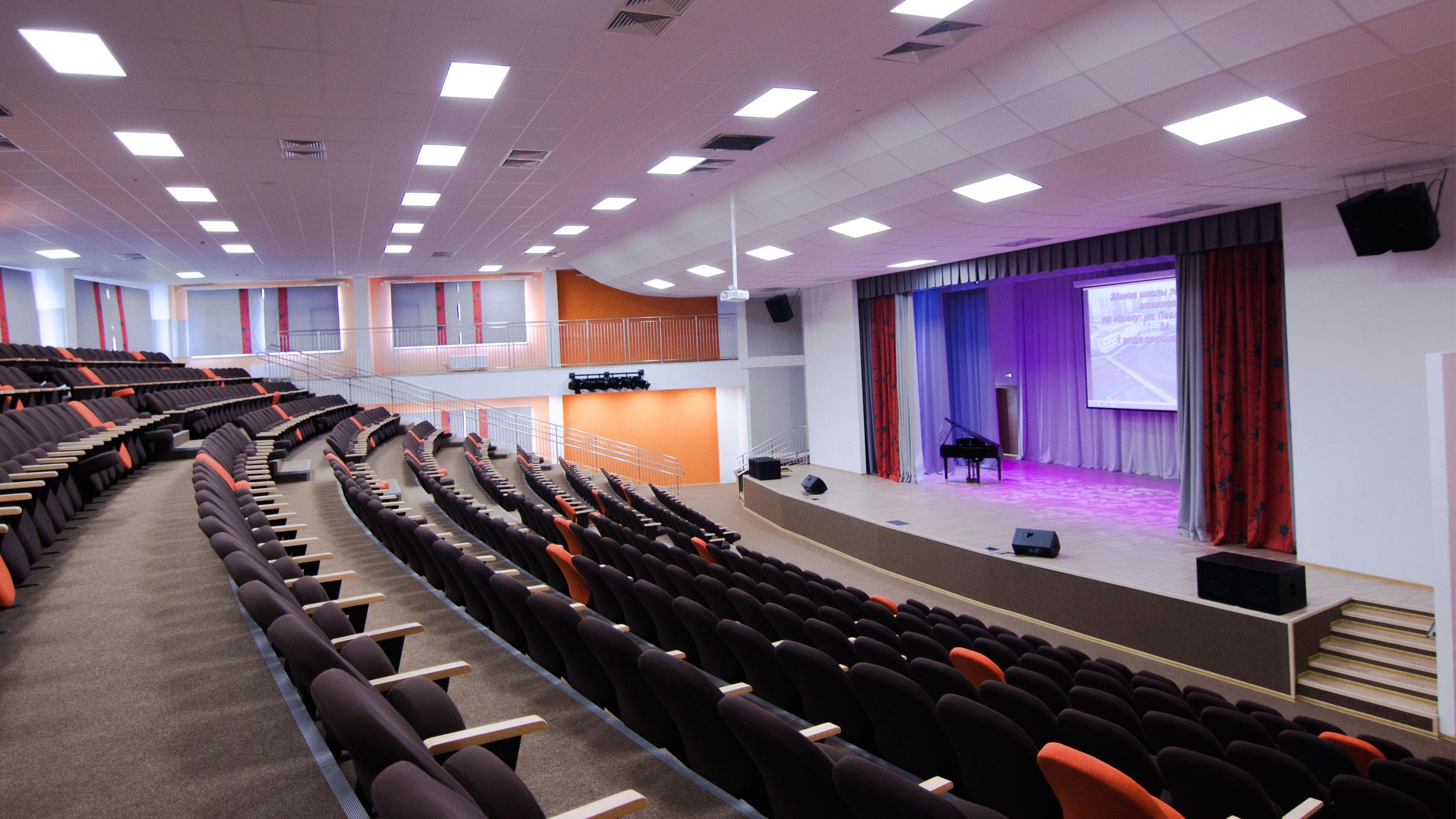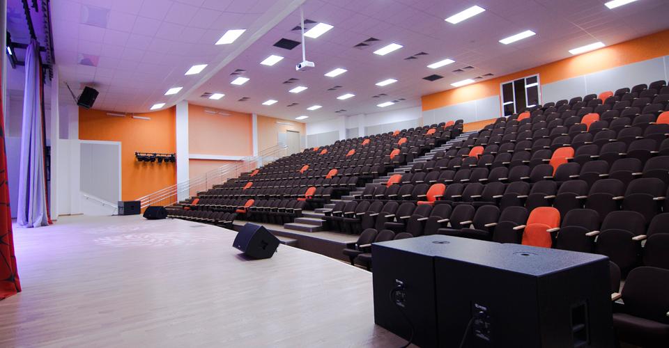 Наподобие театра, актовый зал предусматривает верхнюю механику сцены, комплект профессионального сценического оборудования, просторный зал с мягкими креслами и специально оборудованное место для детей с ограниченными возможностями.
