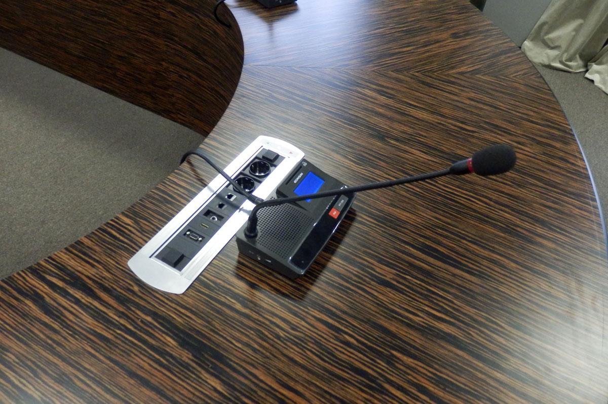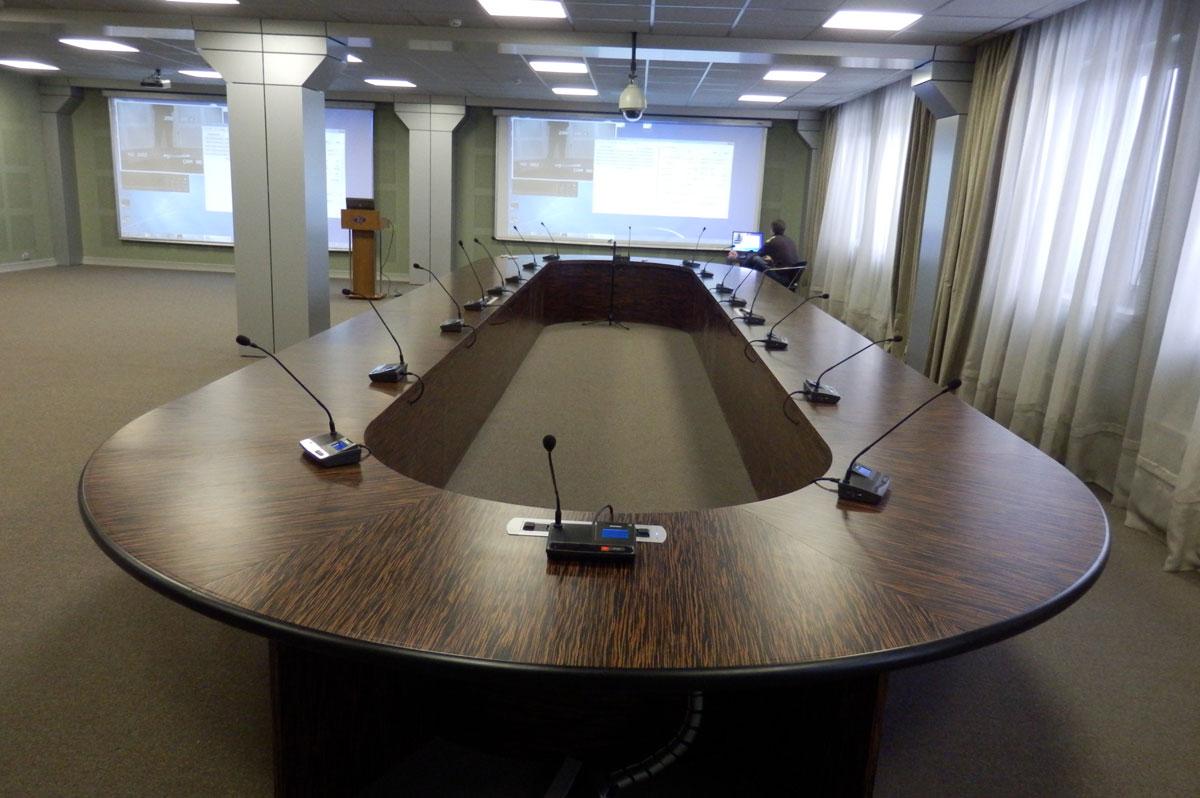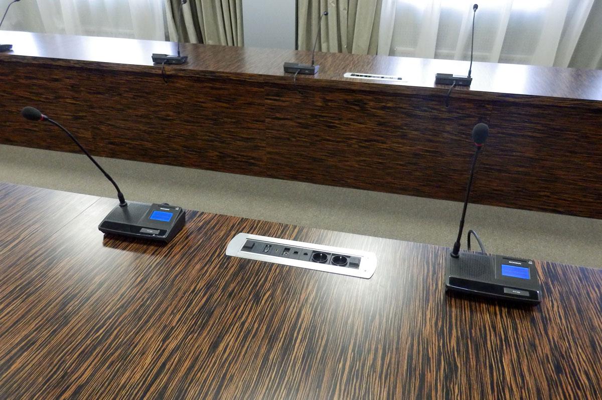 Проект оснащения зала для заседаний разрабатывался компанией «Smart мебель» с учётом всех существующих технических условий, деловых и дизайнерских пожеланий. Основой решения стала проводная конференц-система торговой марки Gonsin. В зале была установлена настольная система серии TL-V6000, рассчитанная на 19 участников, включая председателя.