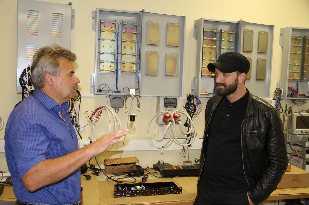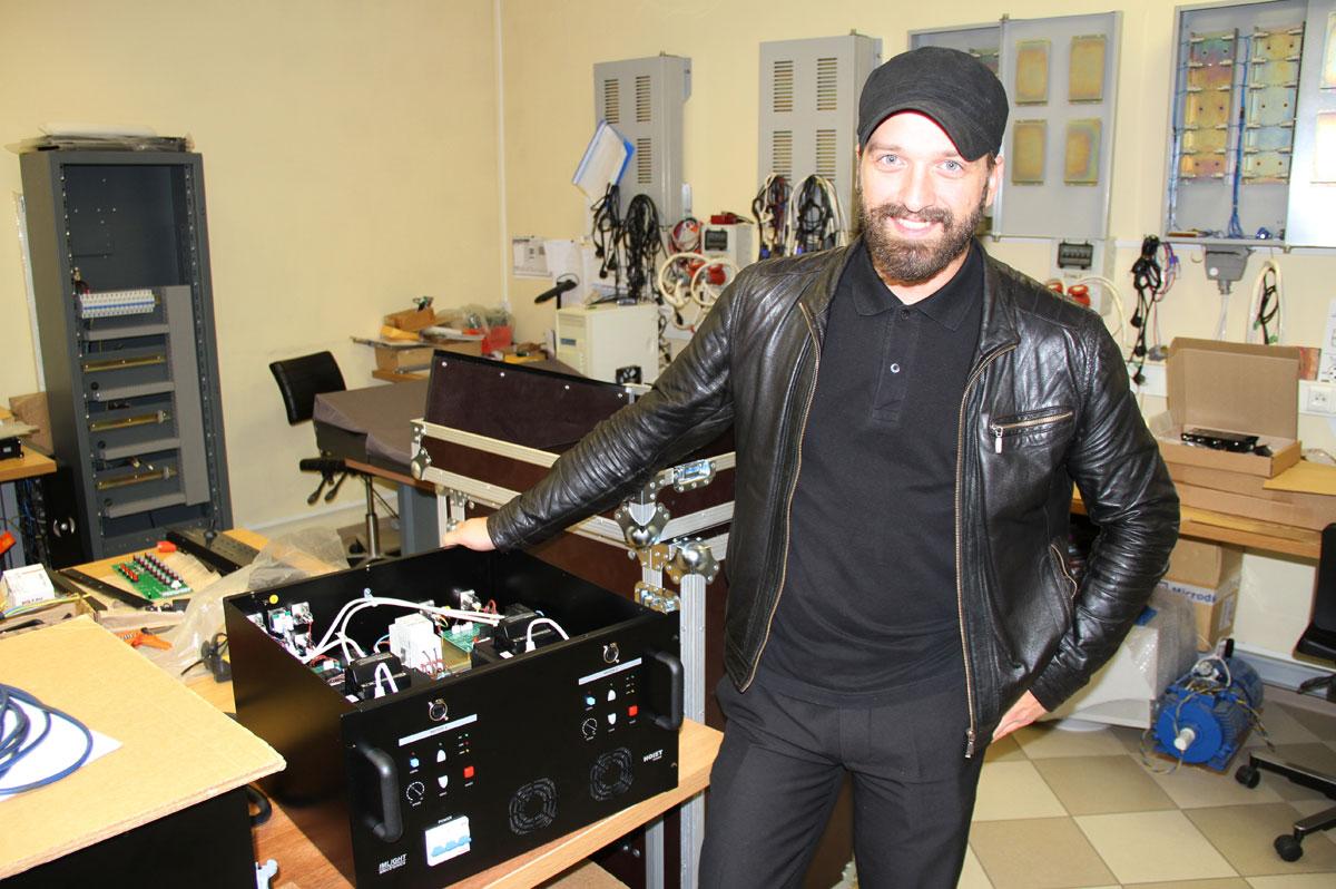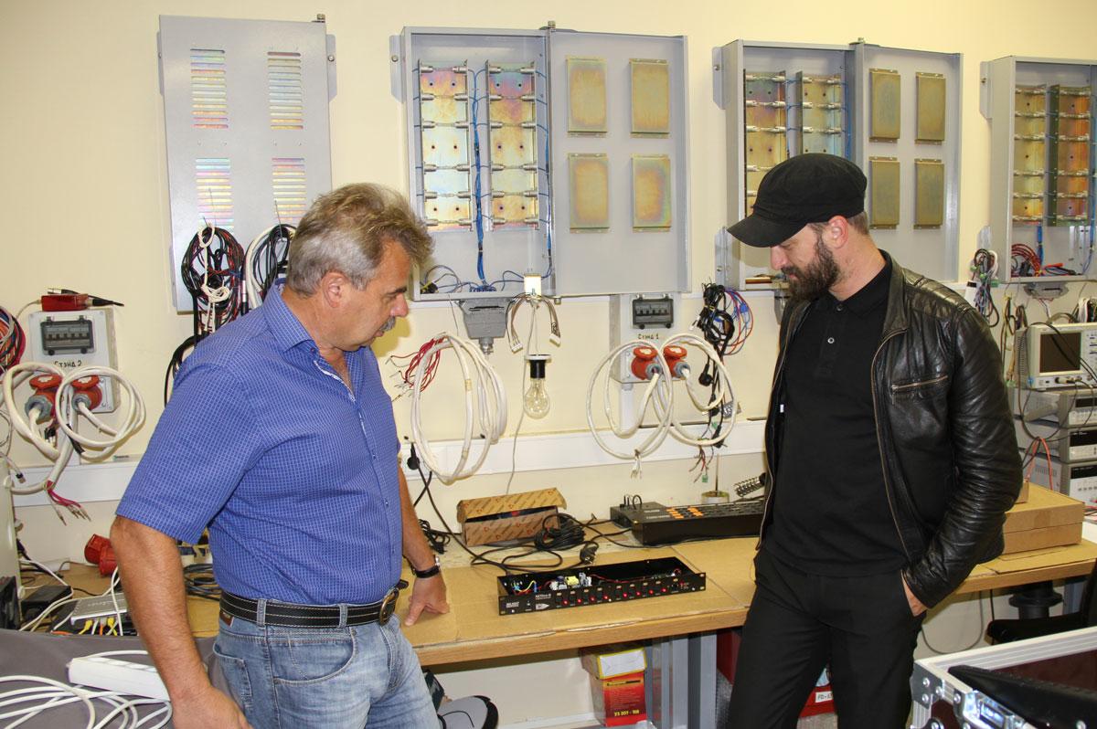 Накануне гастрольного тура «Горизонт событий» Давид Мисакян побывал на производстве силового и электронного оборудования ТМ IMLIGHT, где наблюдал процесс сборки системы управления цепными лебедками для главной декорации шоу – огромного LED-экрана, двигающегося во всех плоскостях. Этот элемент сценографии светодизайнер называет основной «мулечкой» нового тура. Экскурсию по производству для Давида провел руководитель направления Александр Преснецов, он же буквально «в разрезе» показал ключевые особенности линейки преобразователей сигнала NETLINE, на которых светодизайнер уже два года работает в туре с прокатом компании «Имлайт».