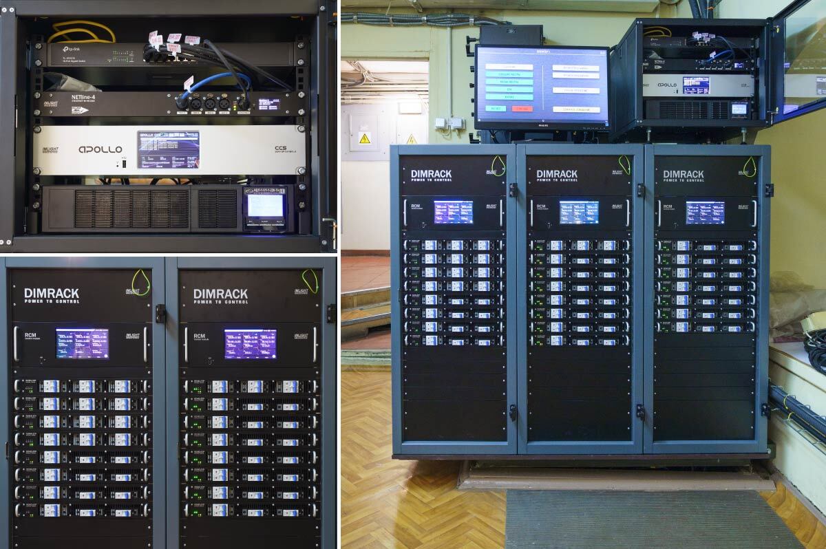 По проектному заданию нужно было организовать удобное и эргономичное управление всем комплексом освещения (люстры, бра, прожекторы) из нескольких точек площадки. Так, старые распределительные шкафы были заменены на шкафы серии DIMRACK с сохранением линий управления «как было», чтобы минимизировать монтажные работы и не повредить исторический паркет помещения. Для управления нагрузкой использованы силовые модули в исполнении: два канала по 5 кВт и четыре канала по 3 кВт.