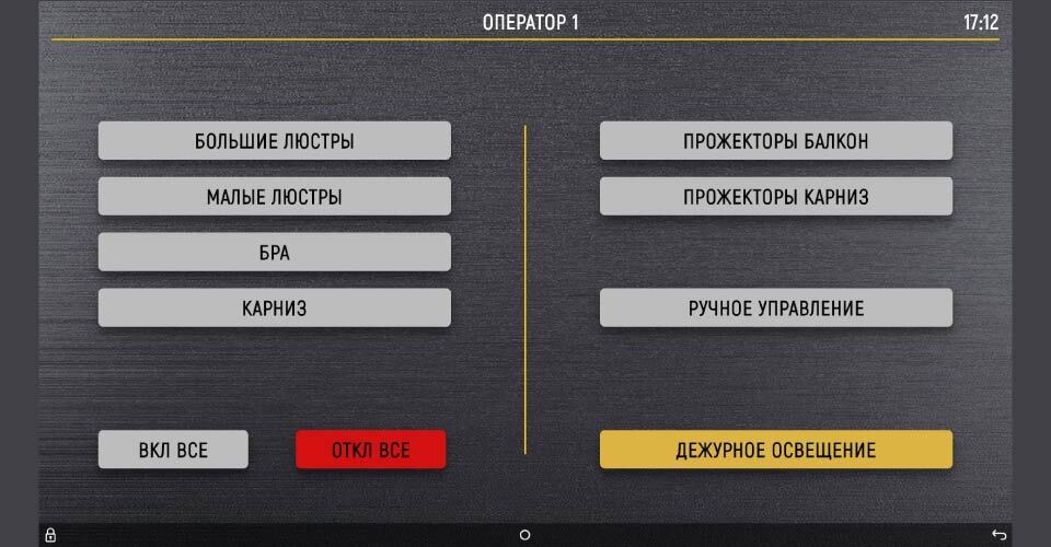 Интеллектуальное управление комплексом освещения, реализованное системой APOLLO, позволяет одним нажатием кнопки активировать различные сценарии освещения и в то же время управлять всеми люстрами и прожекторами индивидуально. Интерфейс графических сенсорных контроллеров интуитивно понятен персоналу площадки без специализированного обучения. Централизованная система управления APOLLO позволяет дублировать управление с различных контроллеров и блокировать вторичные контроллеры с основного поста управления во время проведения мероприятий. При необходимости система управления может масштабироваться дополнительными сенсорными контроллерами и кнопочными постами управления.